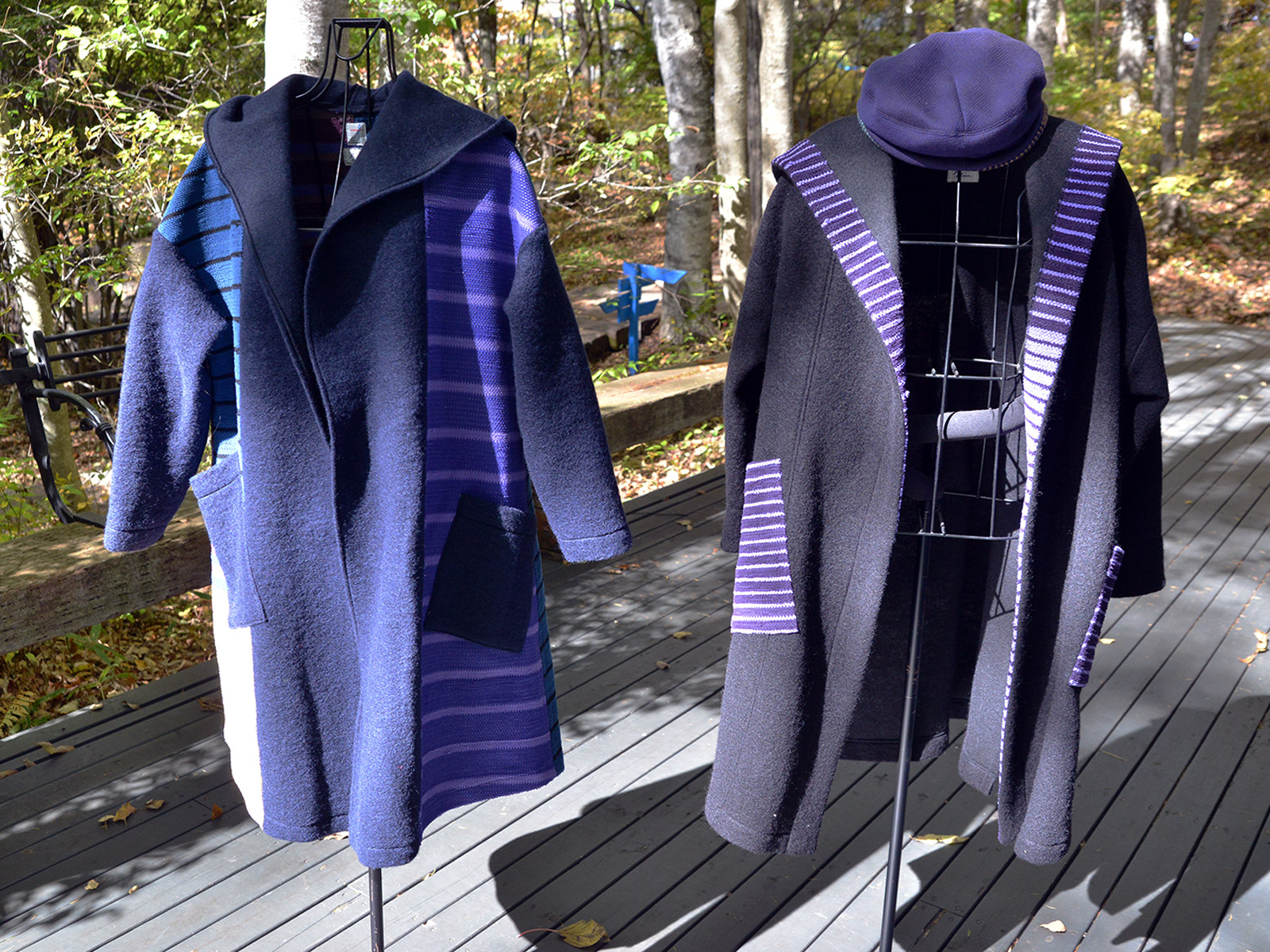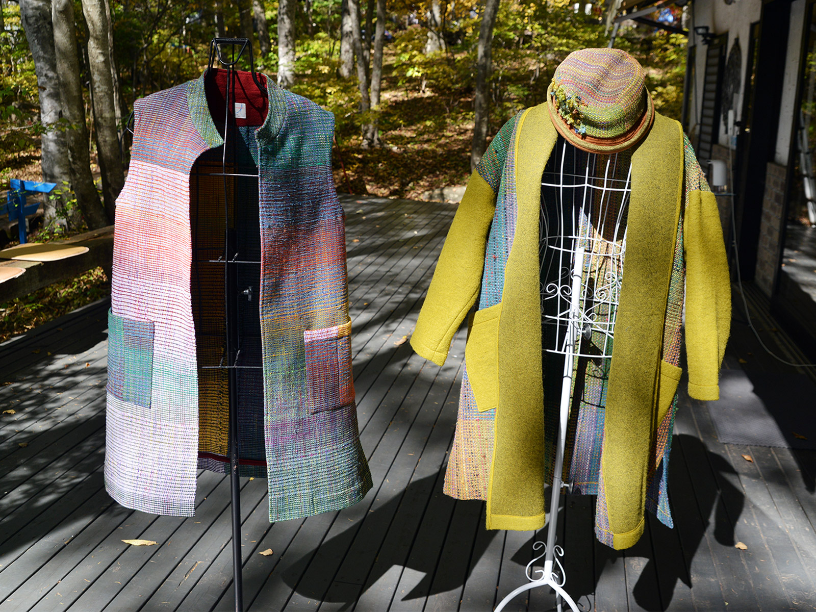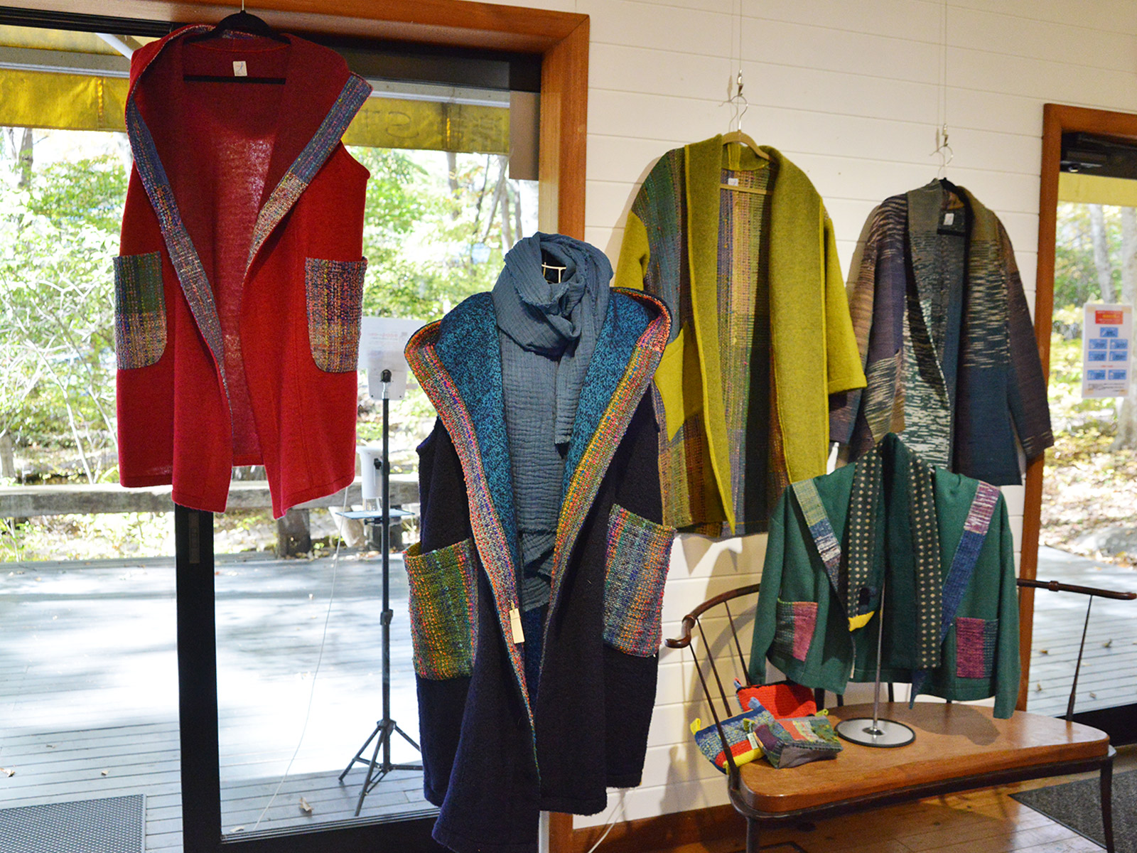 紅葉深まる八ヶ岳倶楽部。鮮やかな緑から赤のグラデーションに負けない、棚機津女さんの色鮮やかなちゃんちゃんこ展が始まりました。