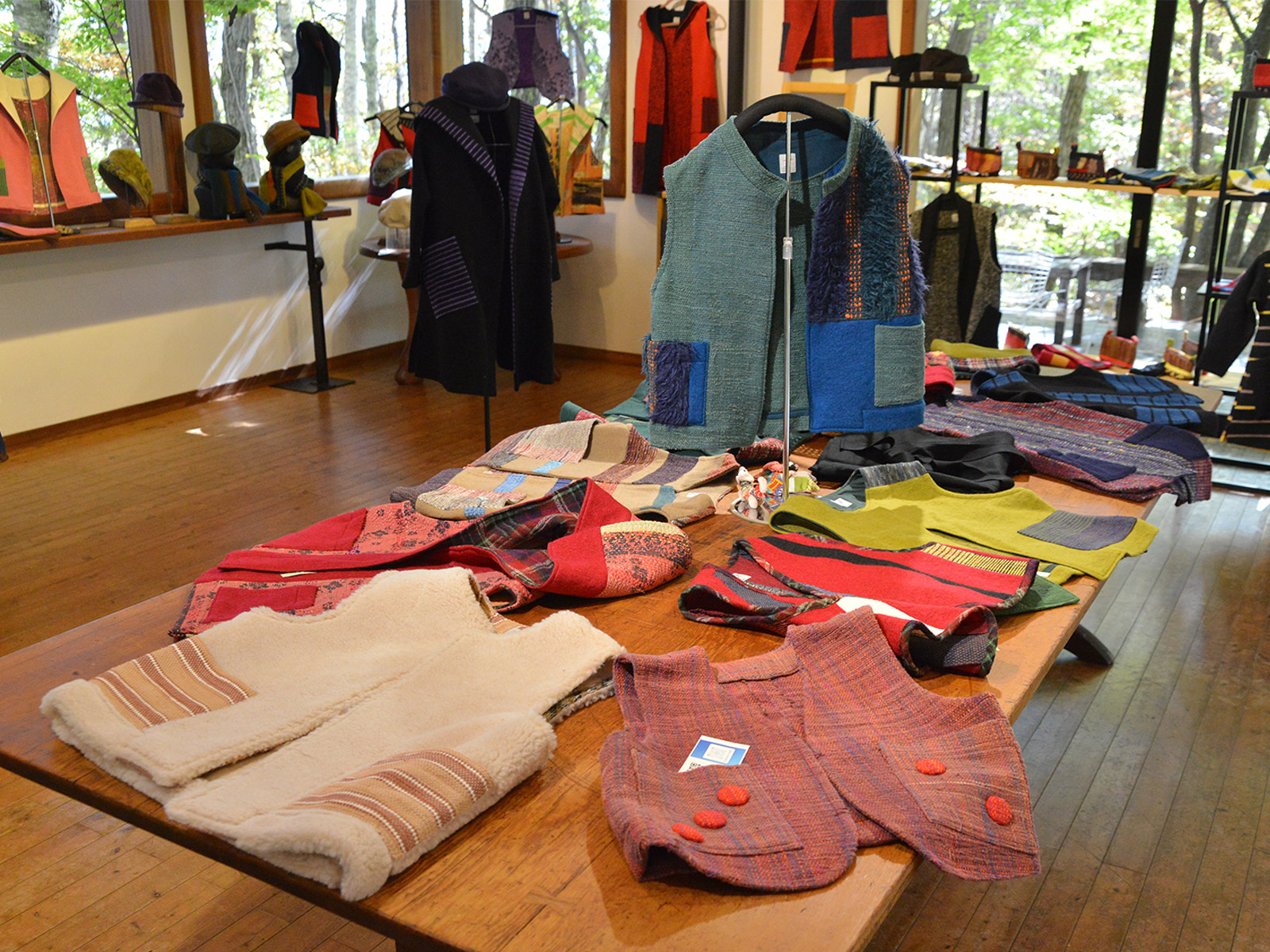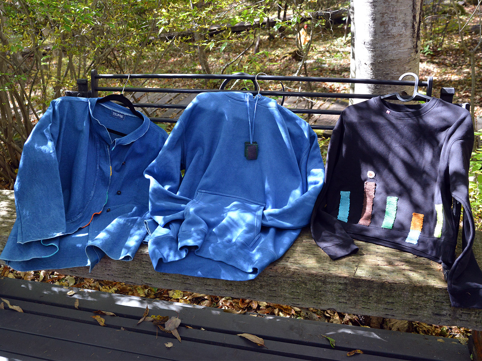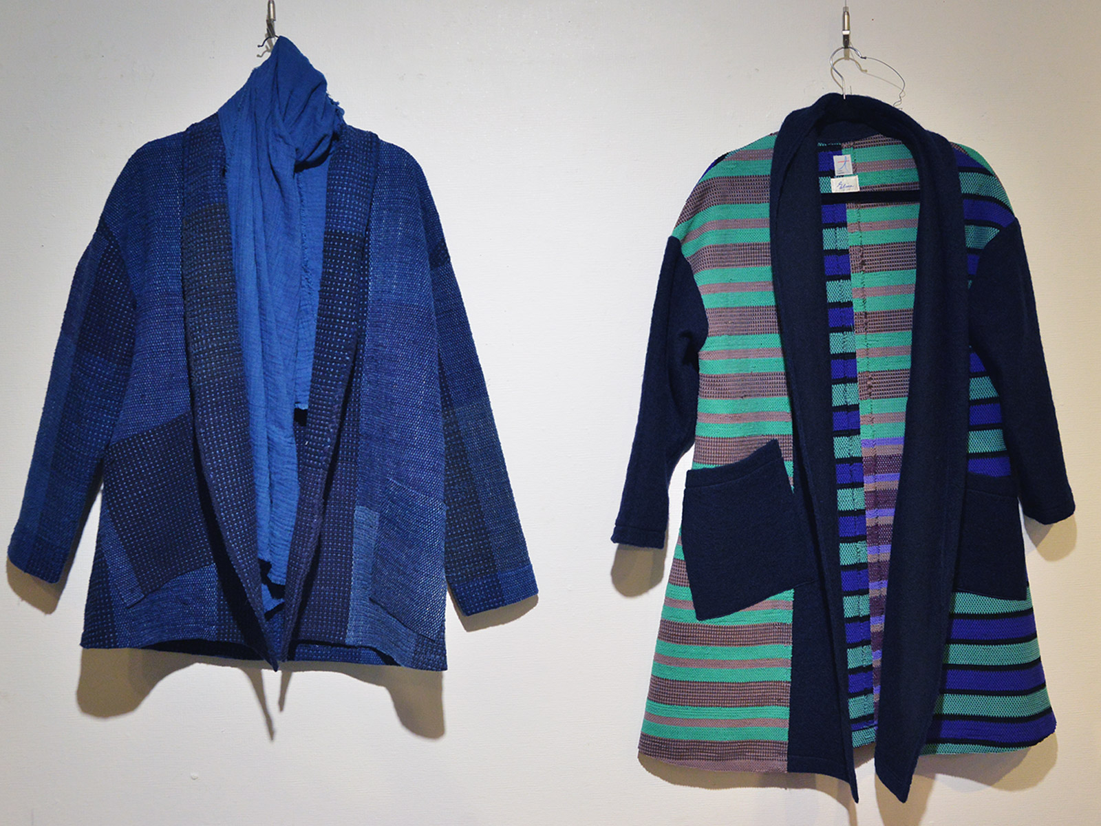 他にも袖付きの上着や、シャツ、藍染のパーカー、マフラーや帽子、ポーチ、ブローチなどの小物も。