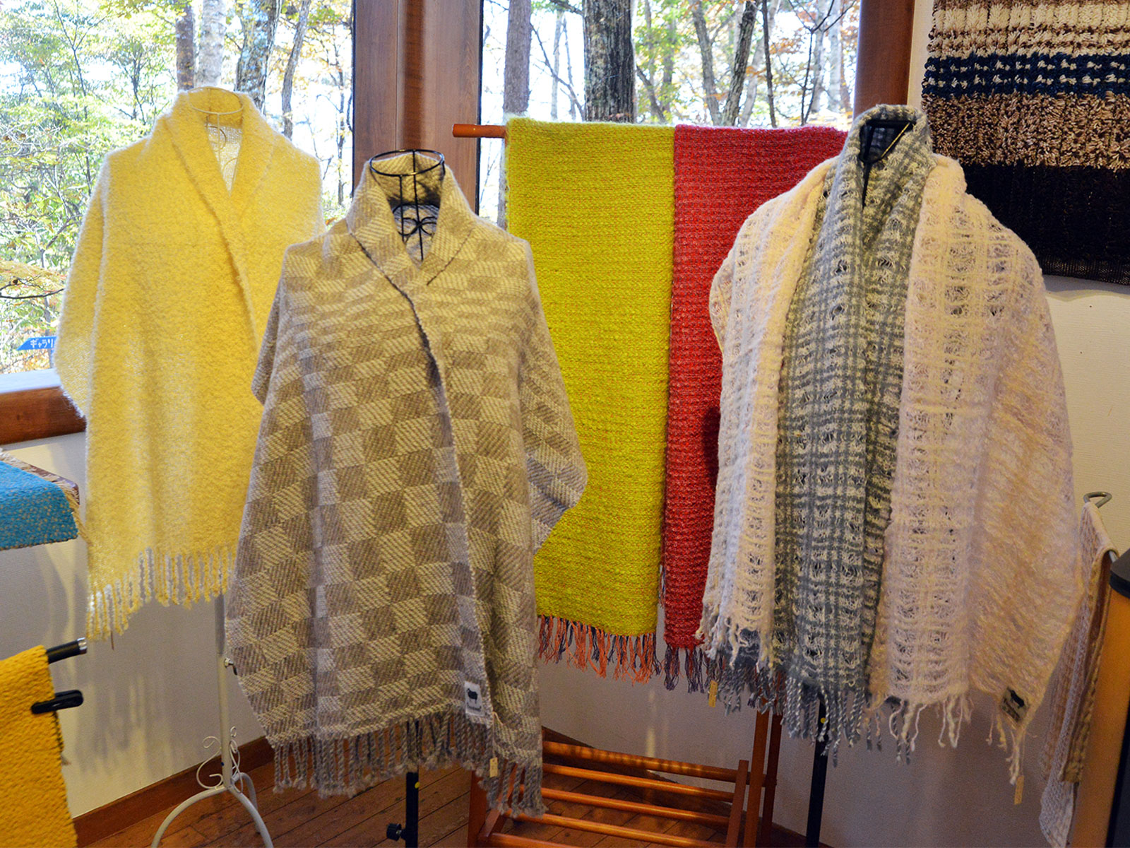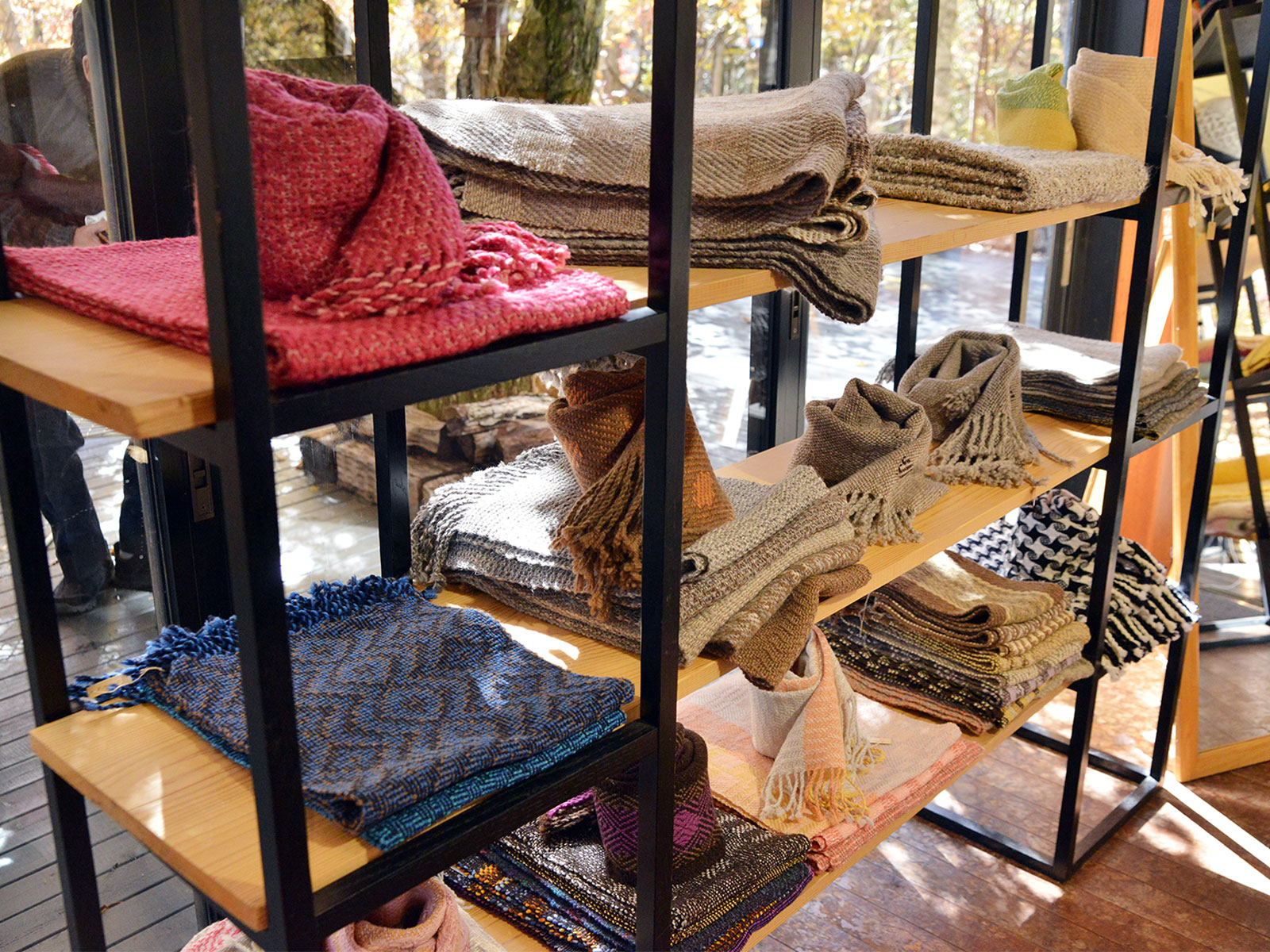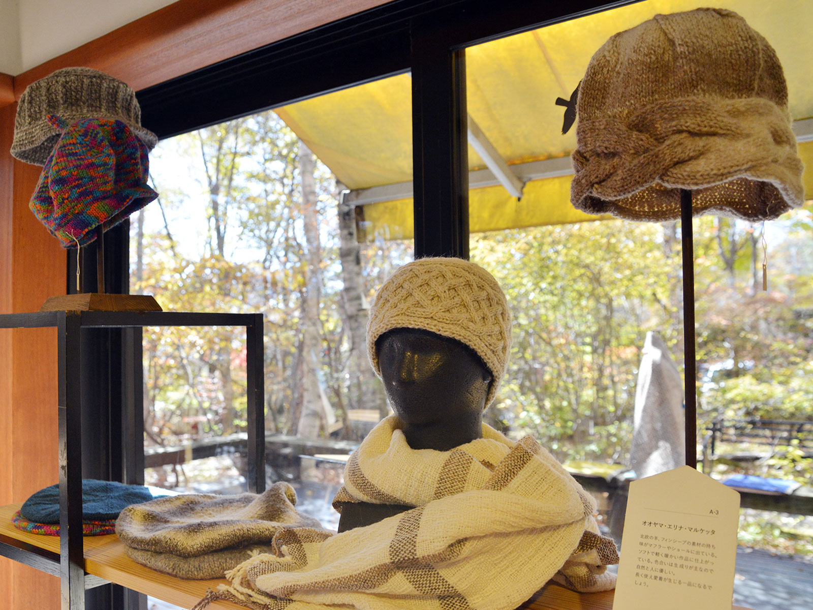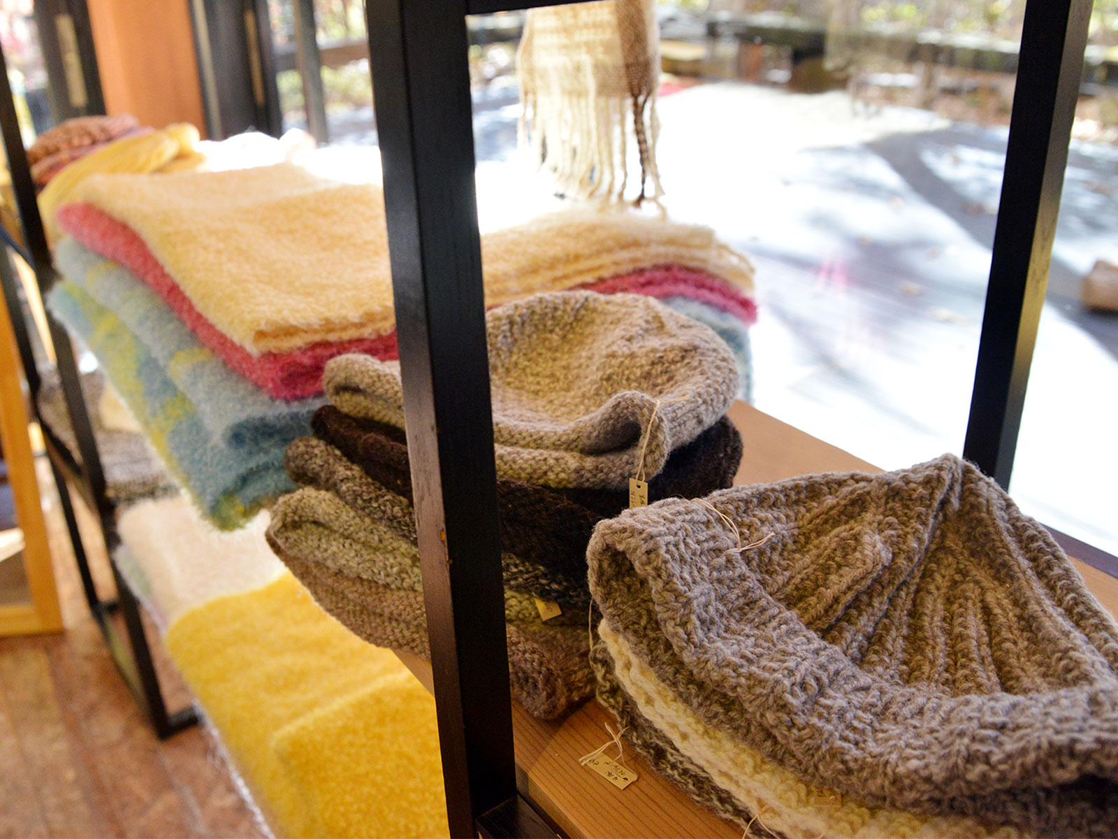 また、手編みのニット帽子や手織り手染めのショール、マフラーも必見!