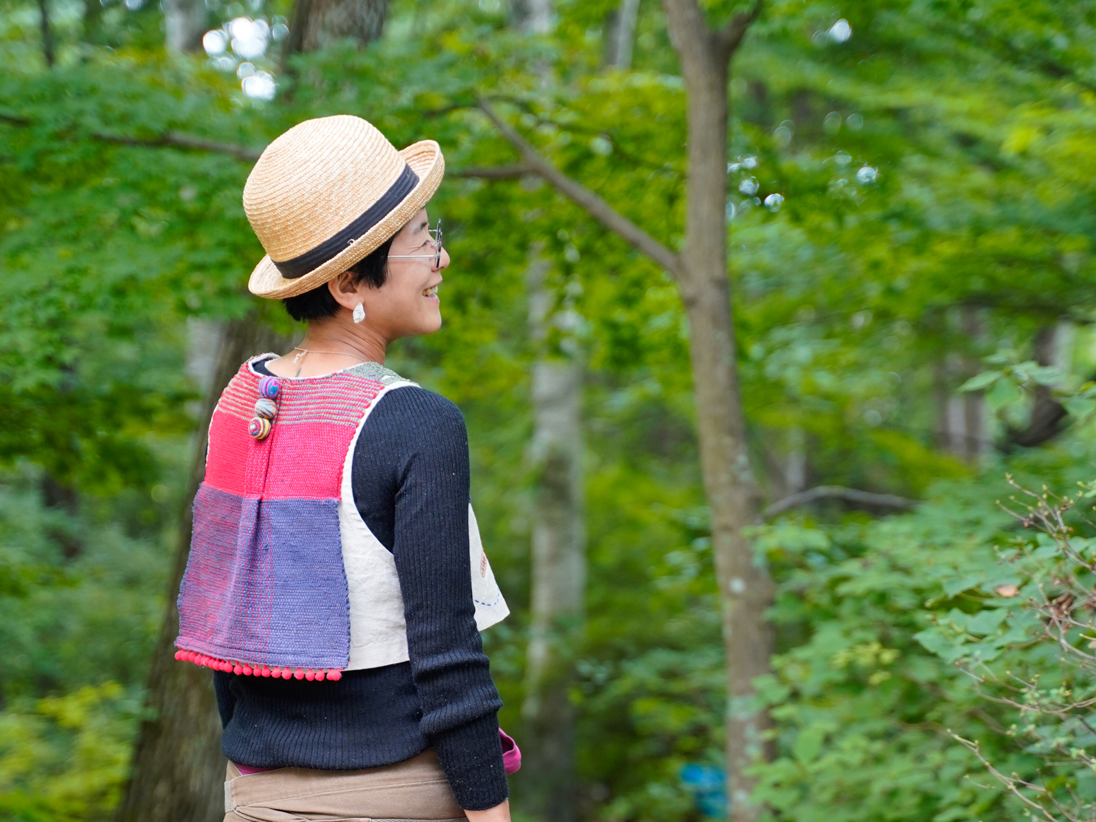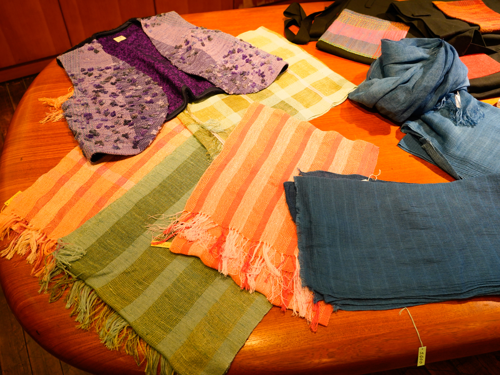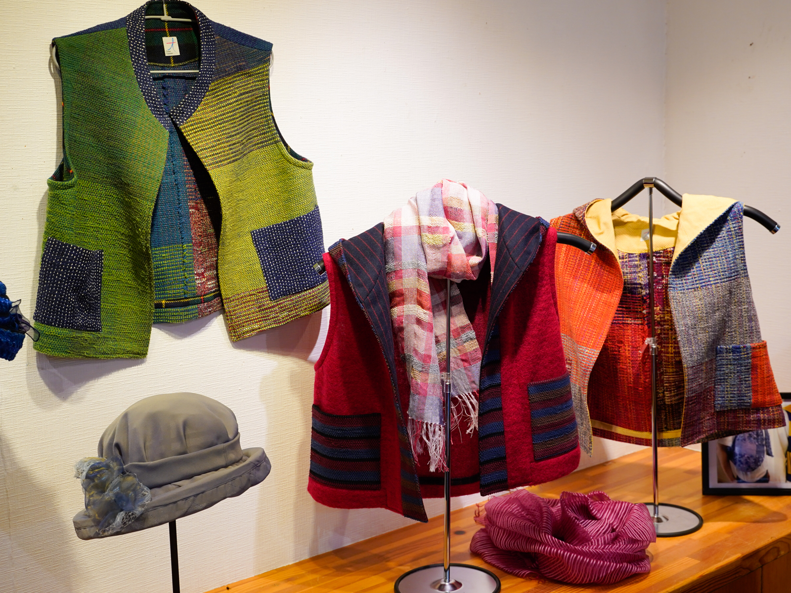Tシャツ以外にも、季節を問わず羽織れる裂き織ベストや手染めストール、ブローチなどもたくさん届いております。