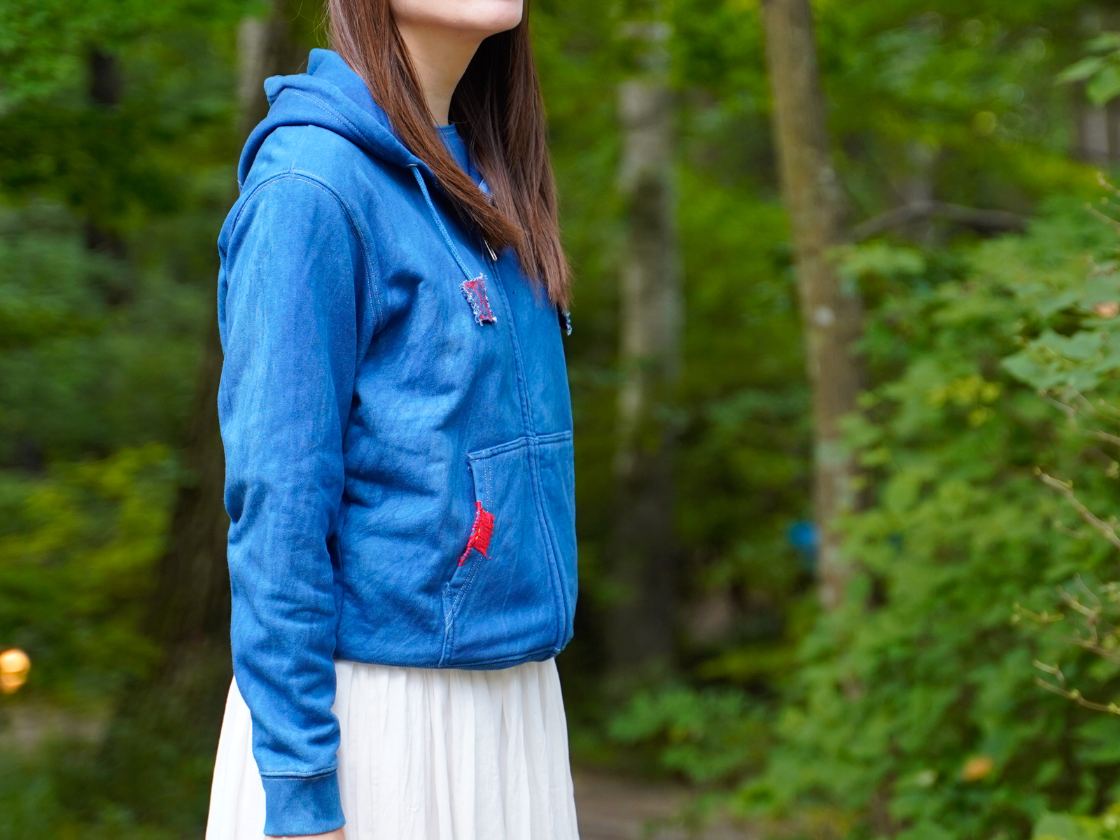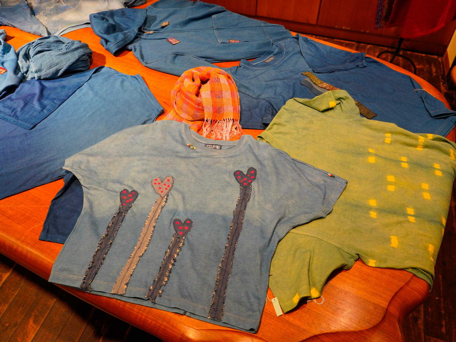 Tシャツやリネンシャツ、パーカーなどにも、裂き織の生地や刺繍、染め模様などがアクセントに使われ、