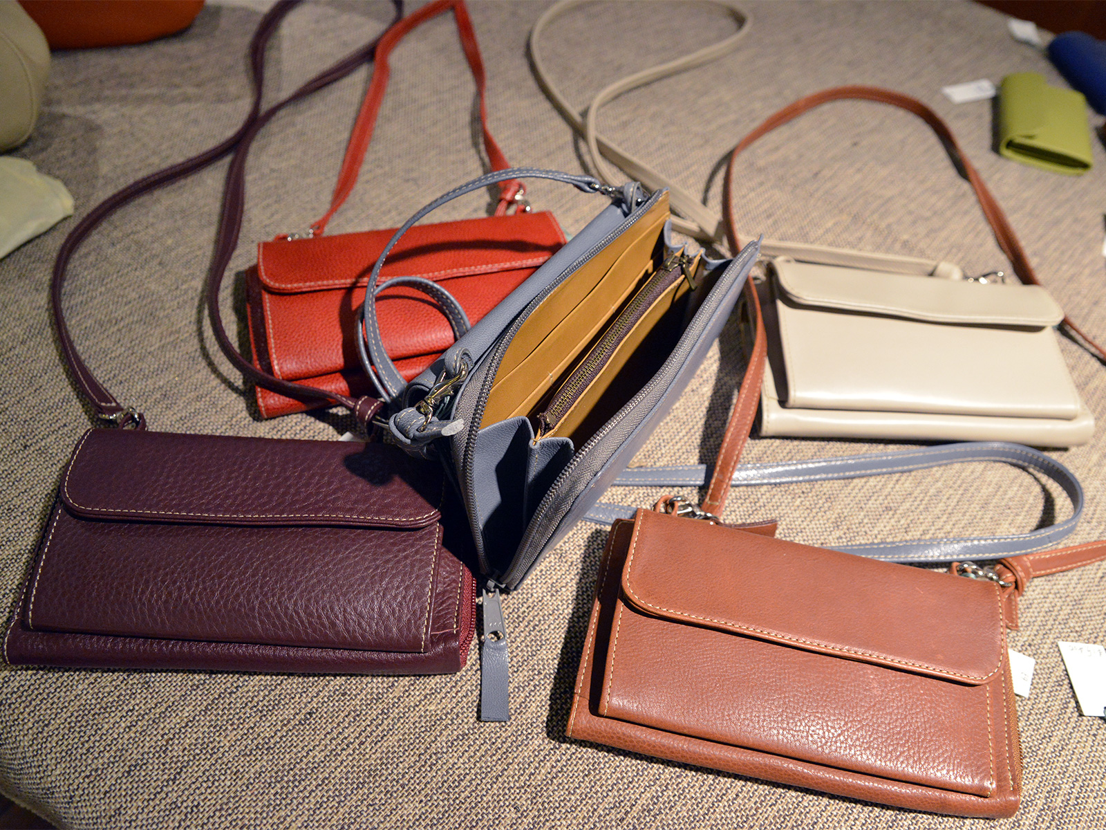 リュック、ボディバッグ、ハンドバッグ、ポシェット、財布やキーケース、等々。