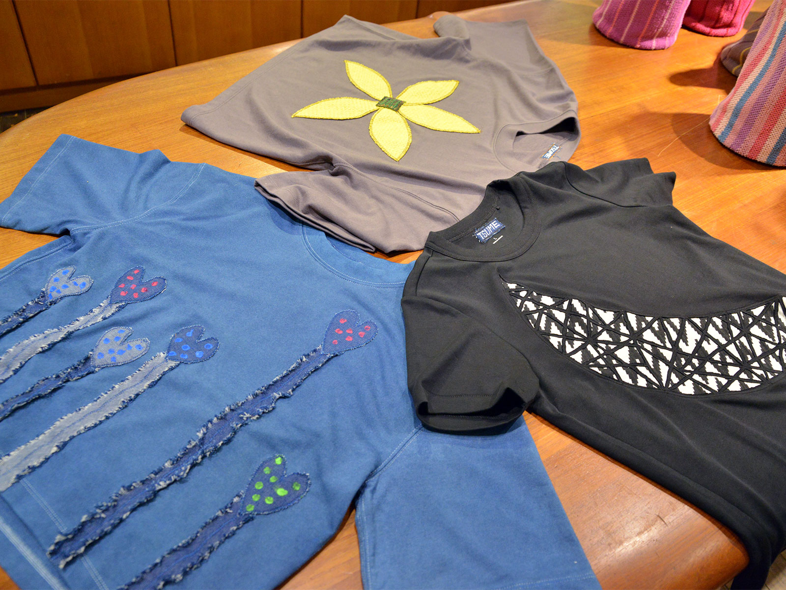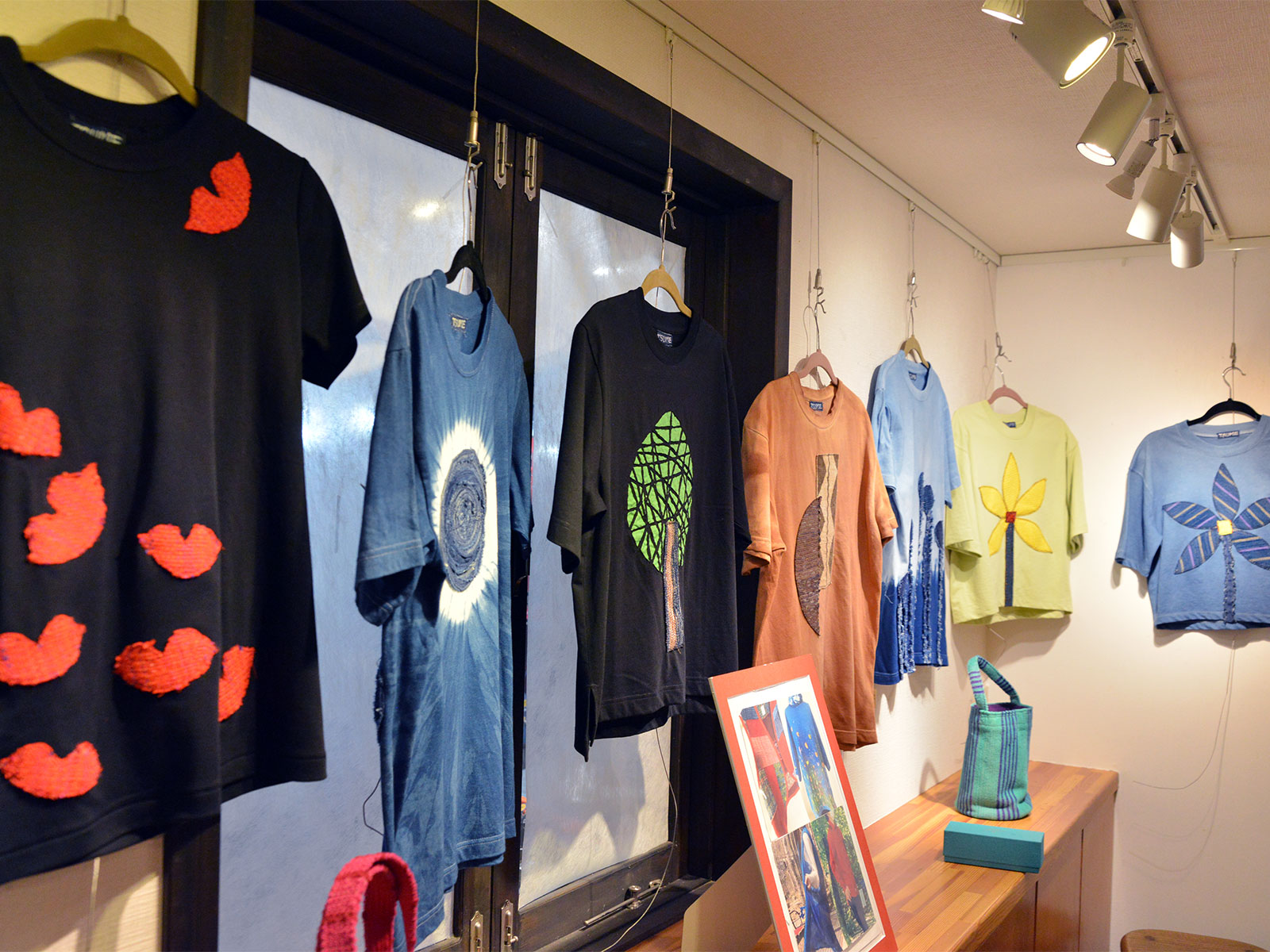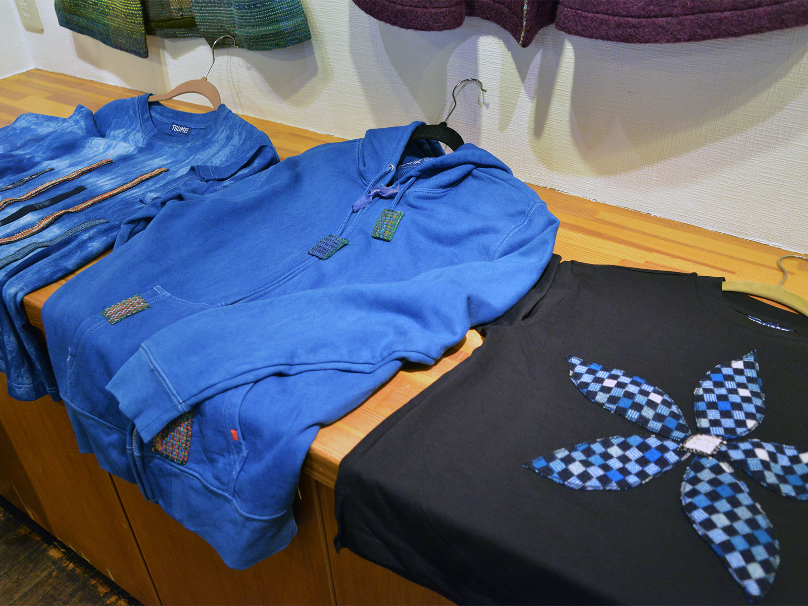 藍染のTシャツを中心に、刺繍やドローイング、裂織のパッチワークなどの組み合わせ。