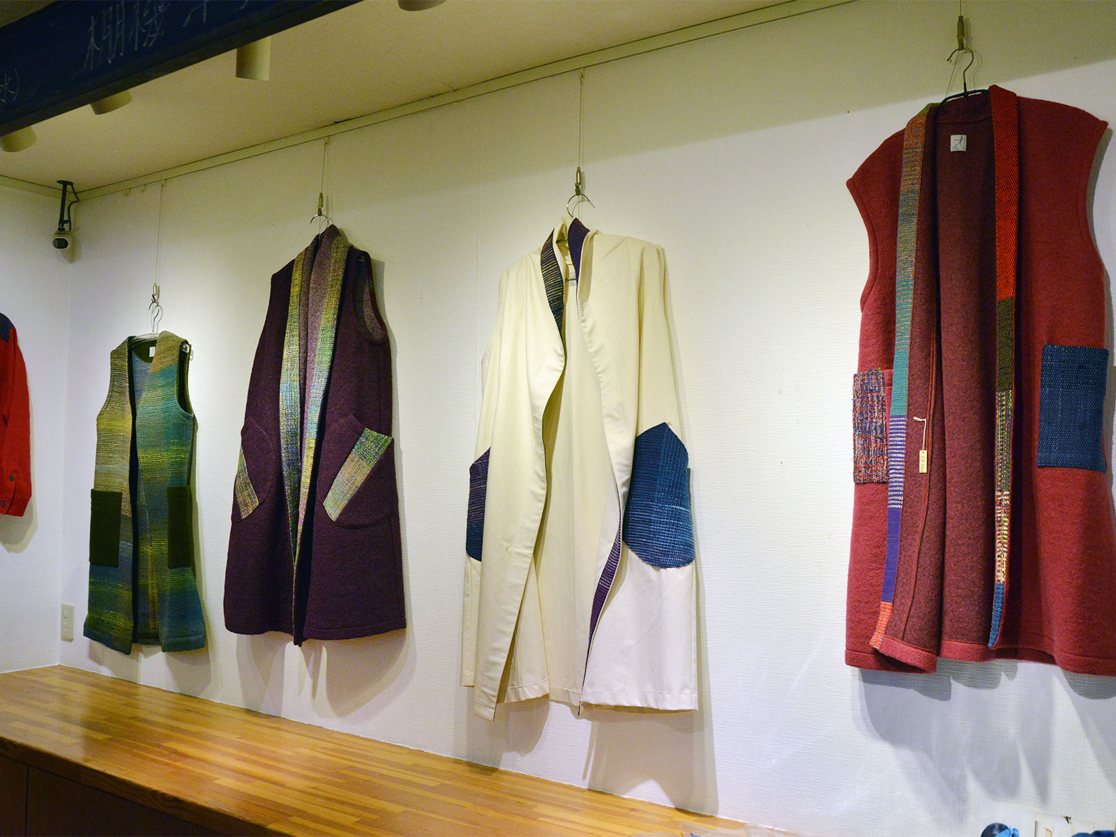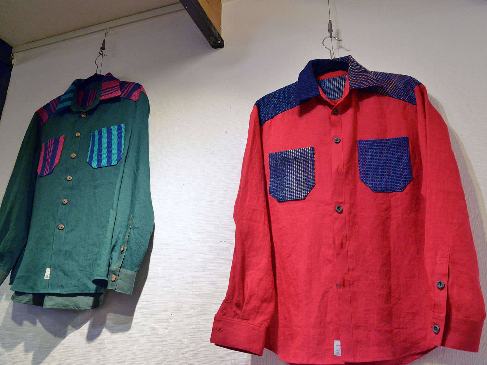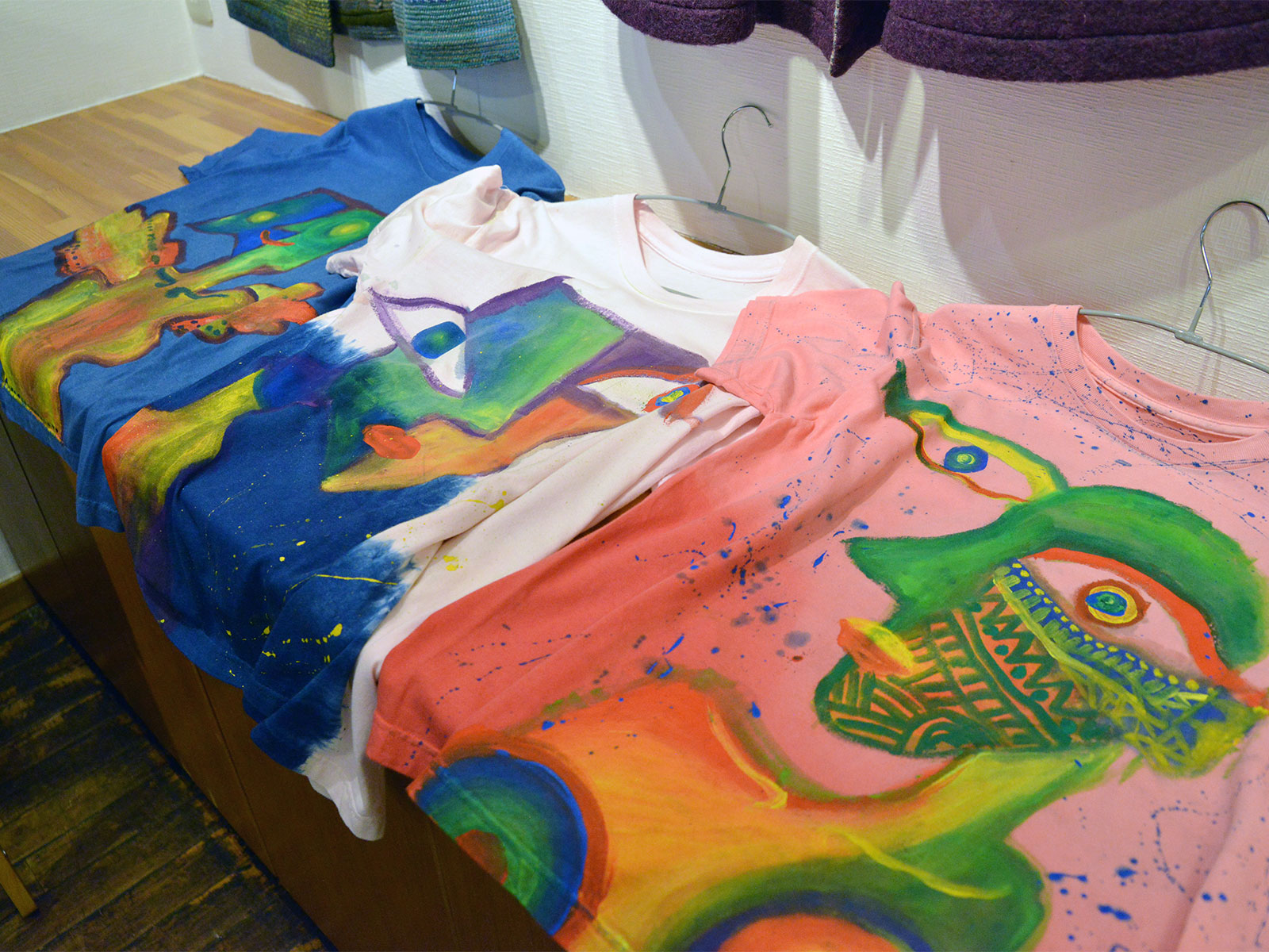 藍染のTシャツを中心に、刺繍やドローイング、裂織のパッチワークなどの組み合わせ。