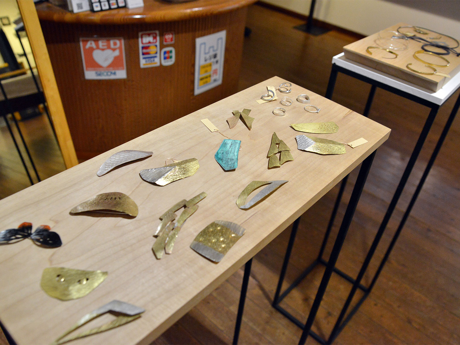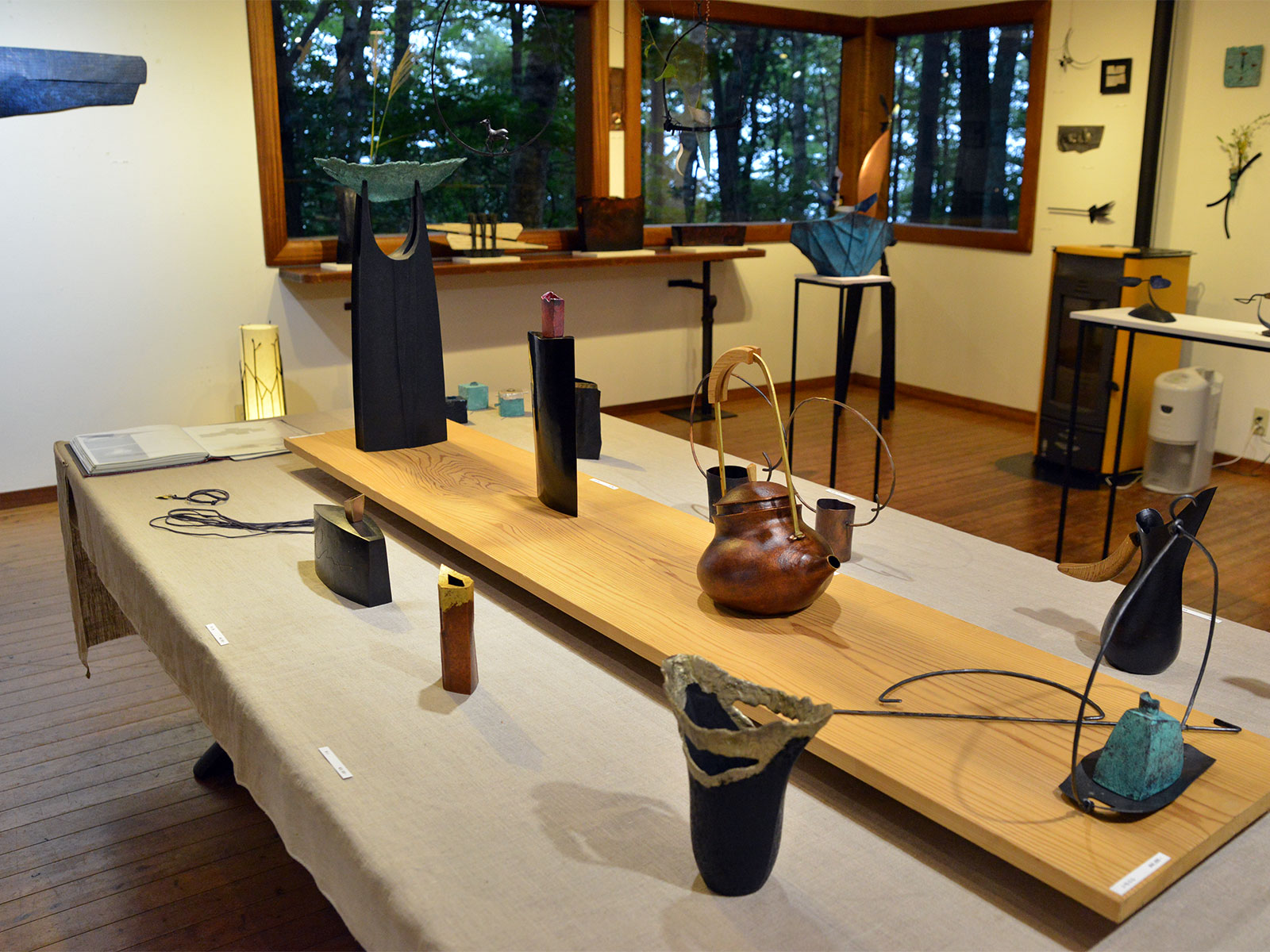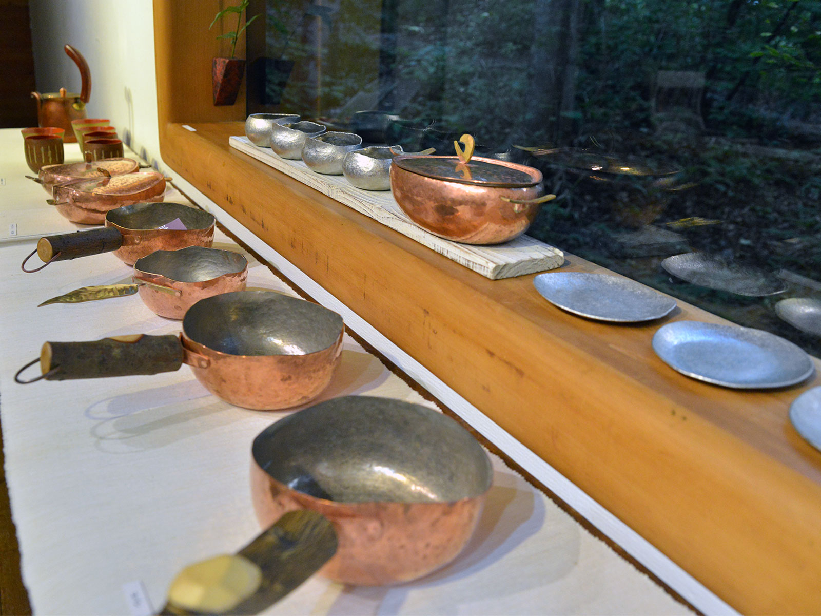 様々な金属(銅、鉄、ステンレス、チタン、金、銀、錫…)に、時には木材、漆も併せて作り上げられる作品たち。