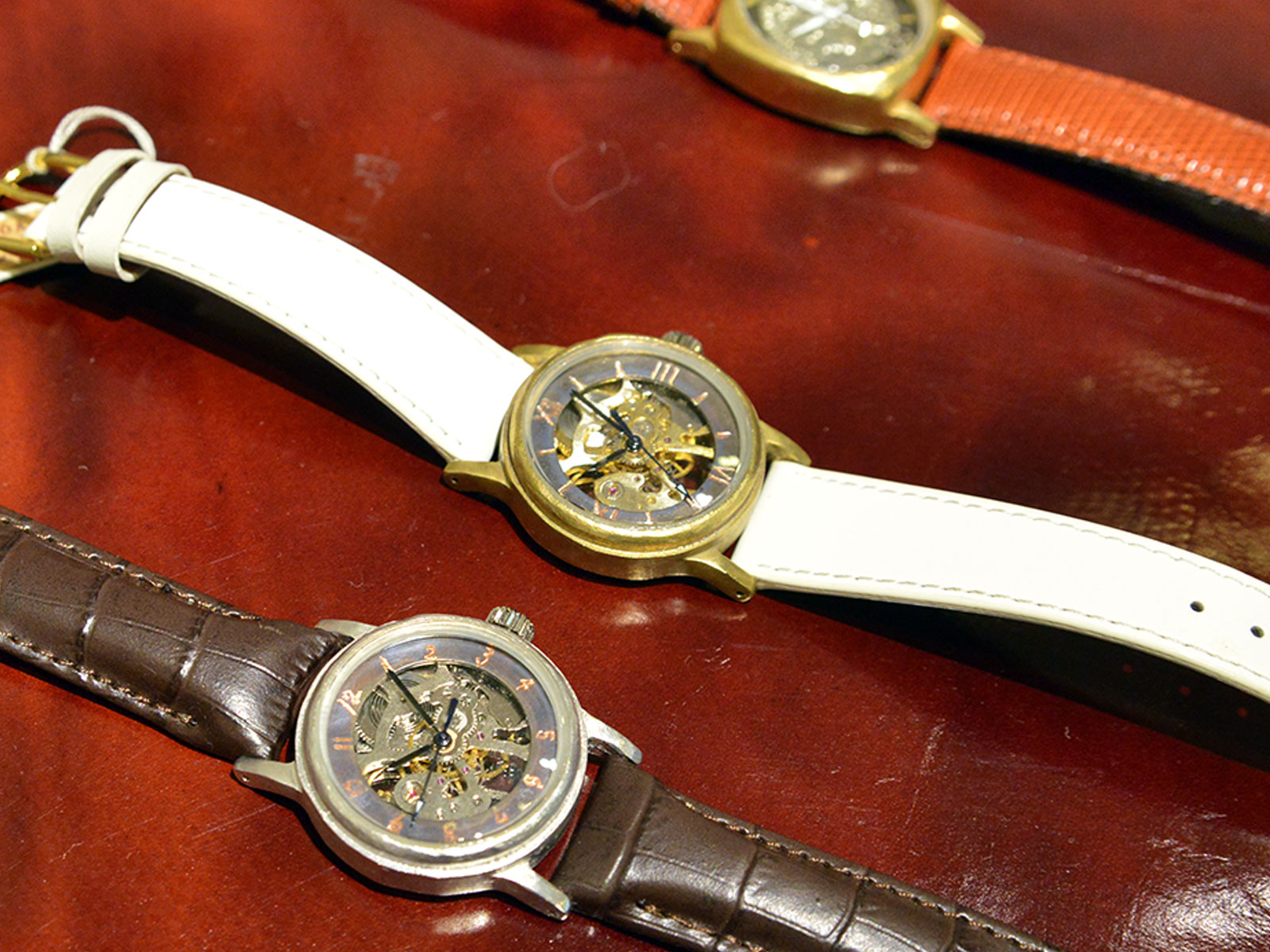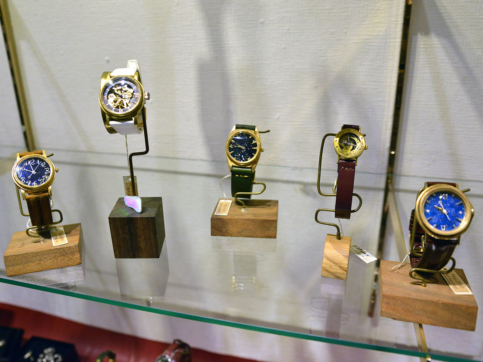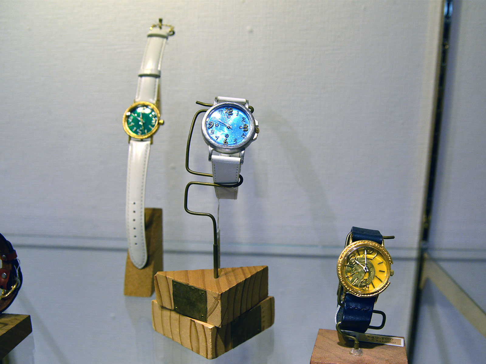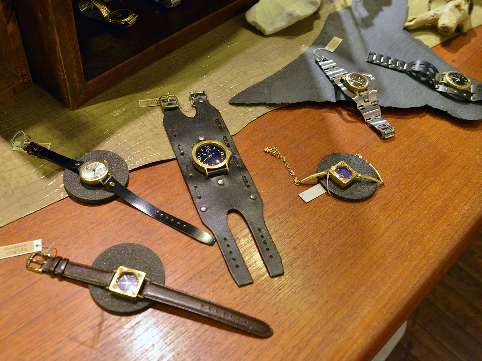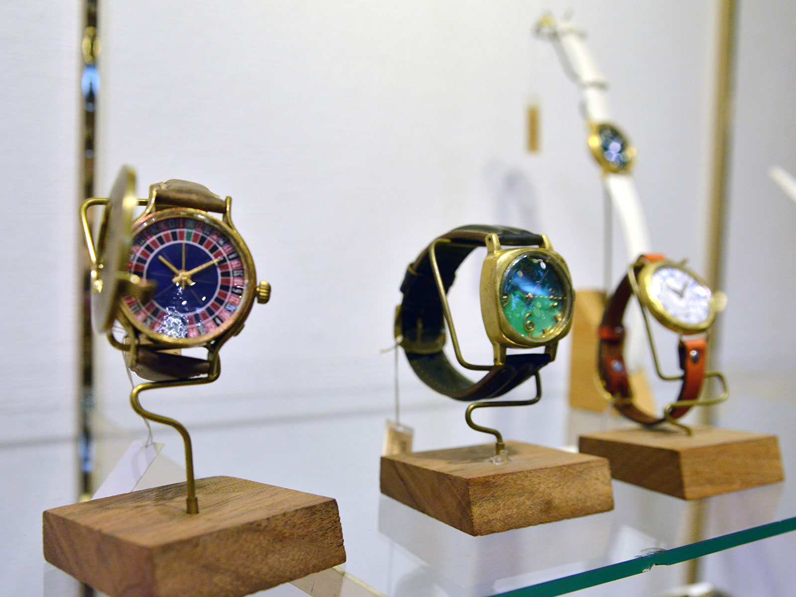 ベルトや盤面も手作りの世界で一つの時計がずらりと並びます。