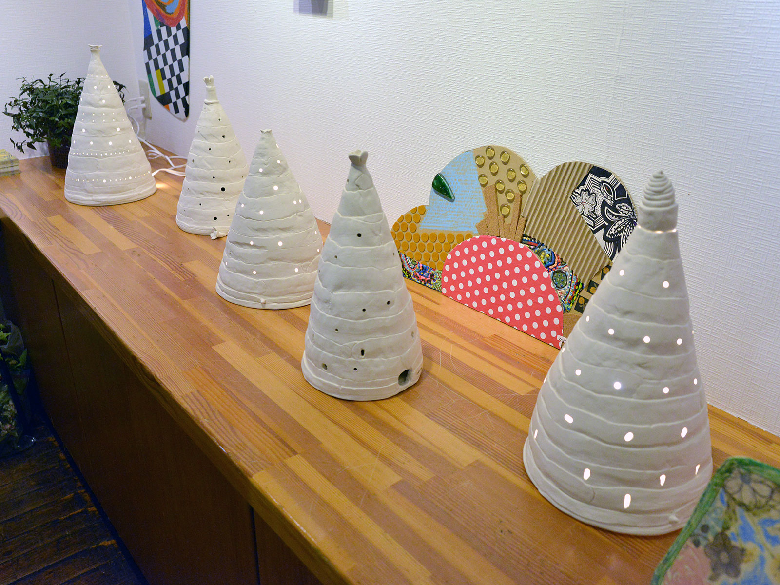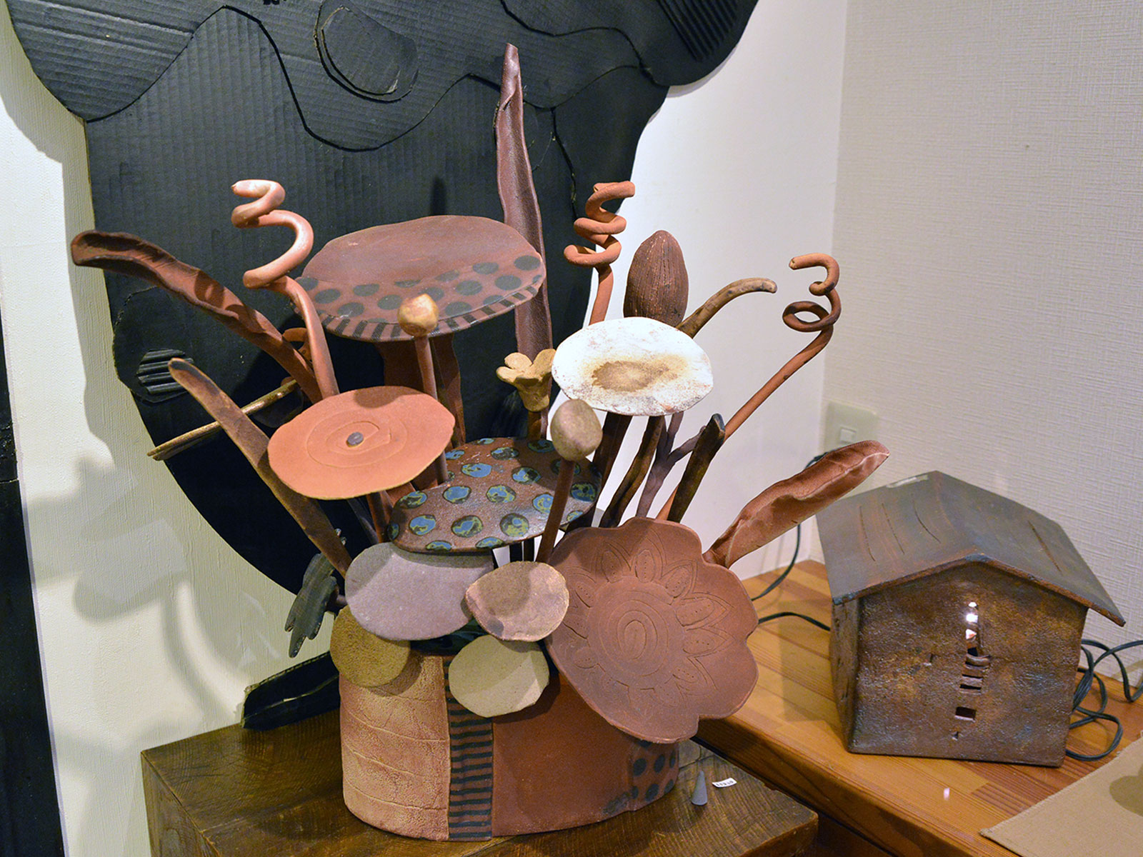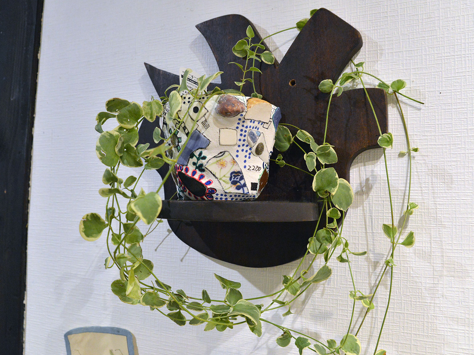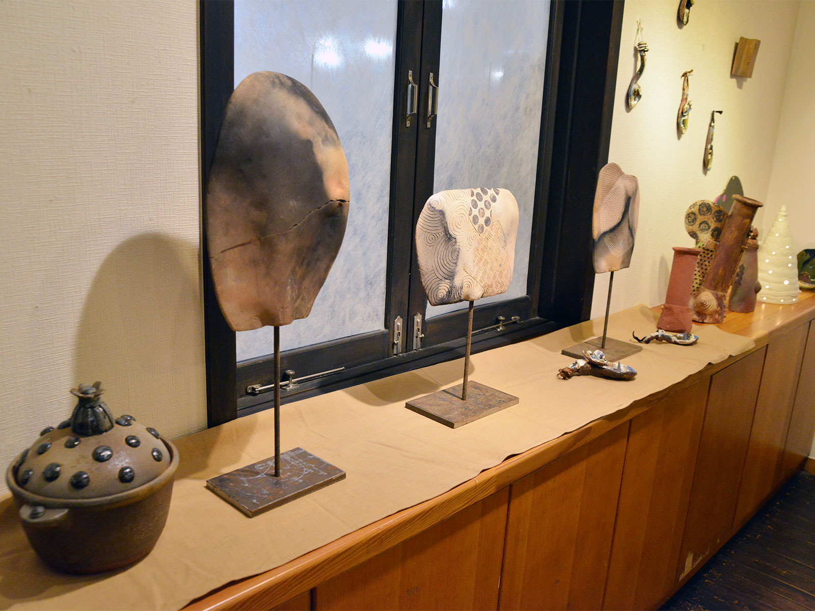 オブジェや壁掛け作品は、ユニークな形が目を惹きます。