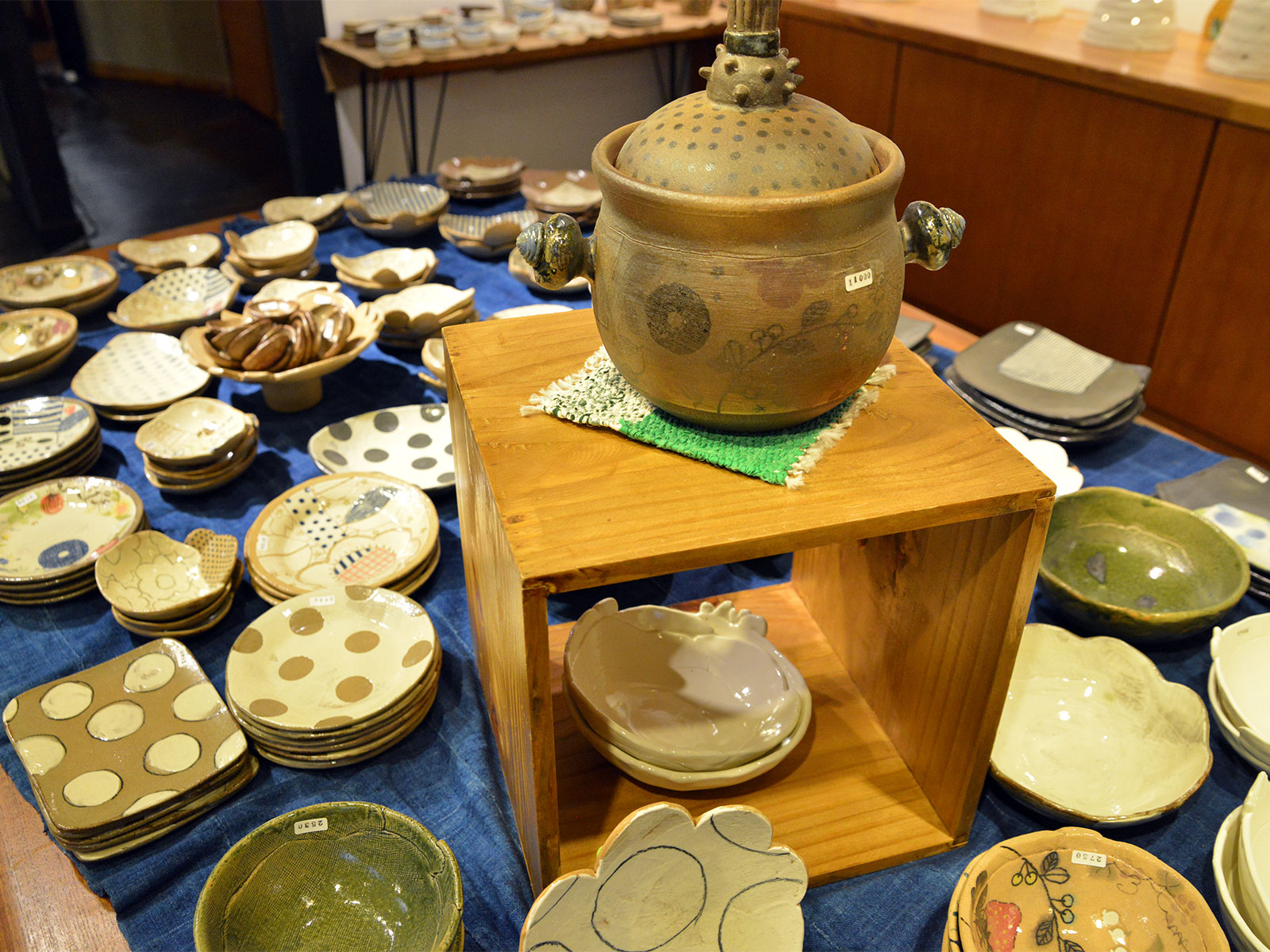 今回の高芝さんの展示では温かみある手捻りやろくろの器、ユニークでポップな造形がずらり。