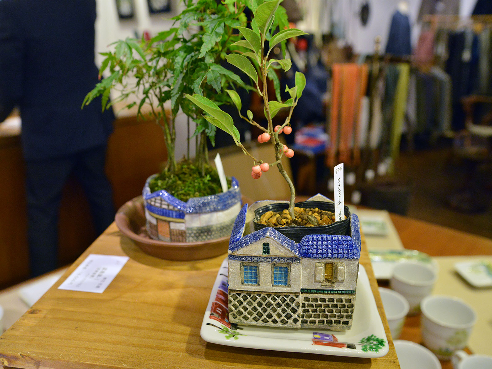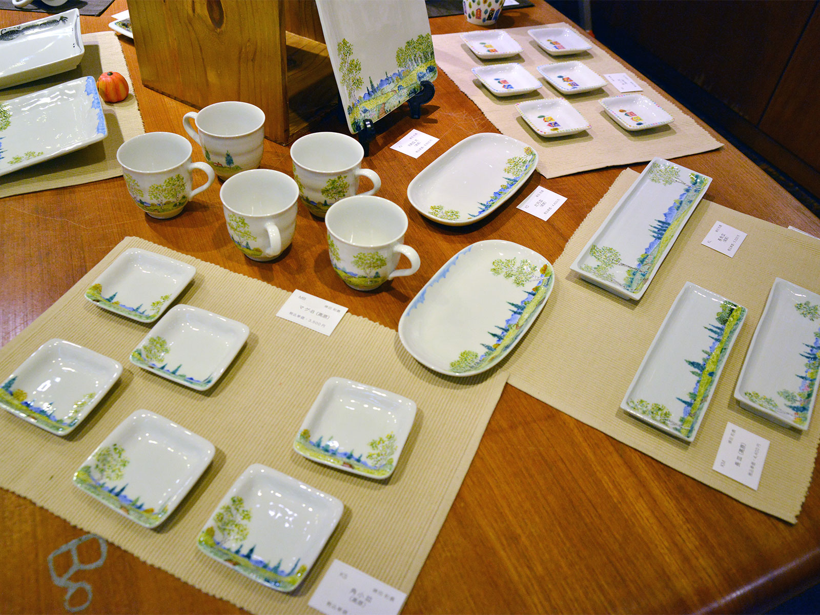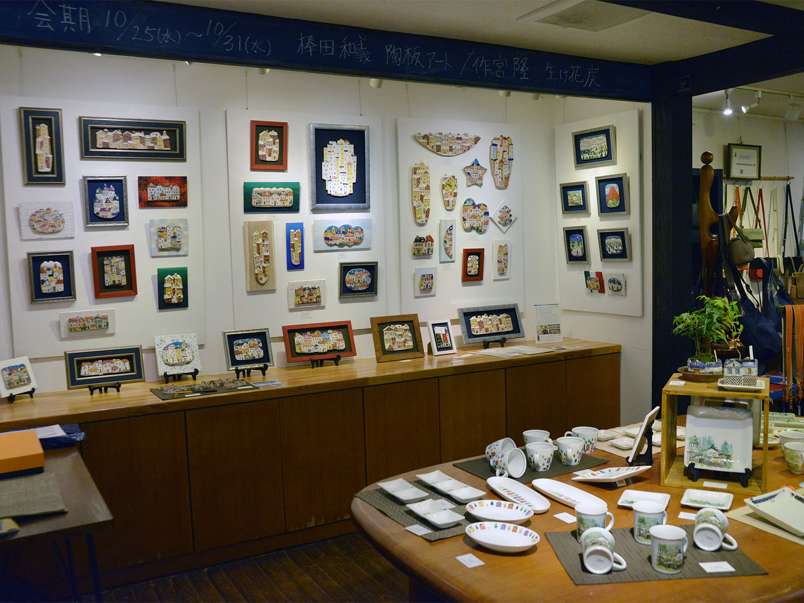 他にも花の雄しべまで繊細に描かれた陶板画や、食器、小物も。