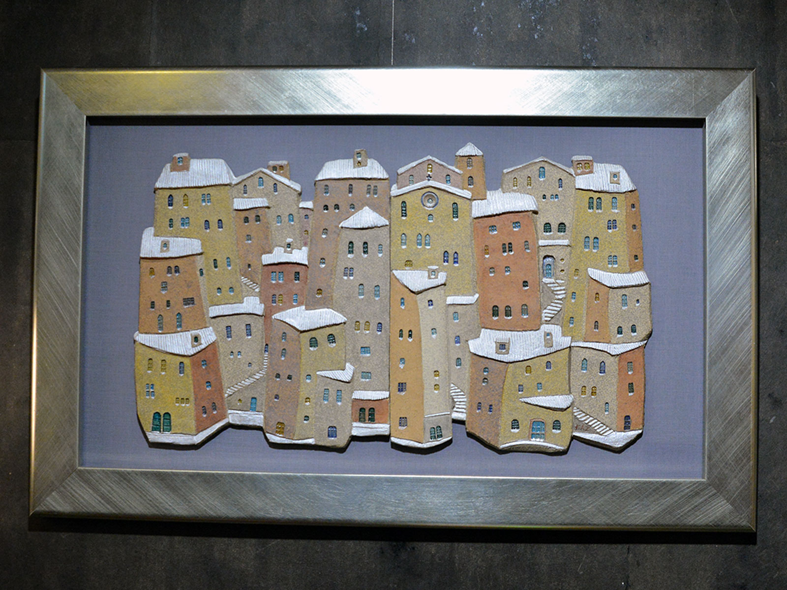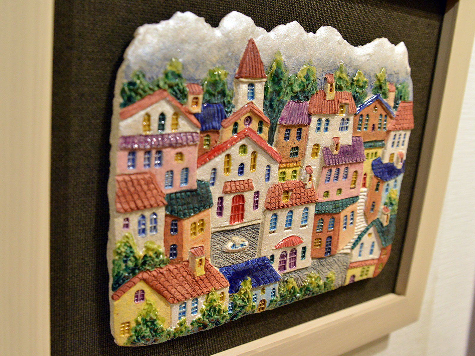 半立体の陶板アートは見る角度や光の当たり方でも少しずつ雰囲気が変わります。
