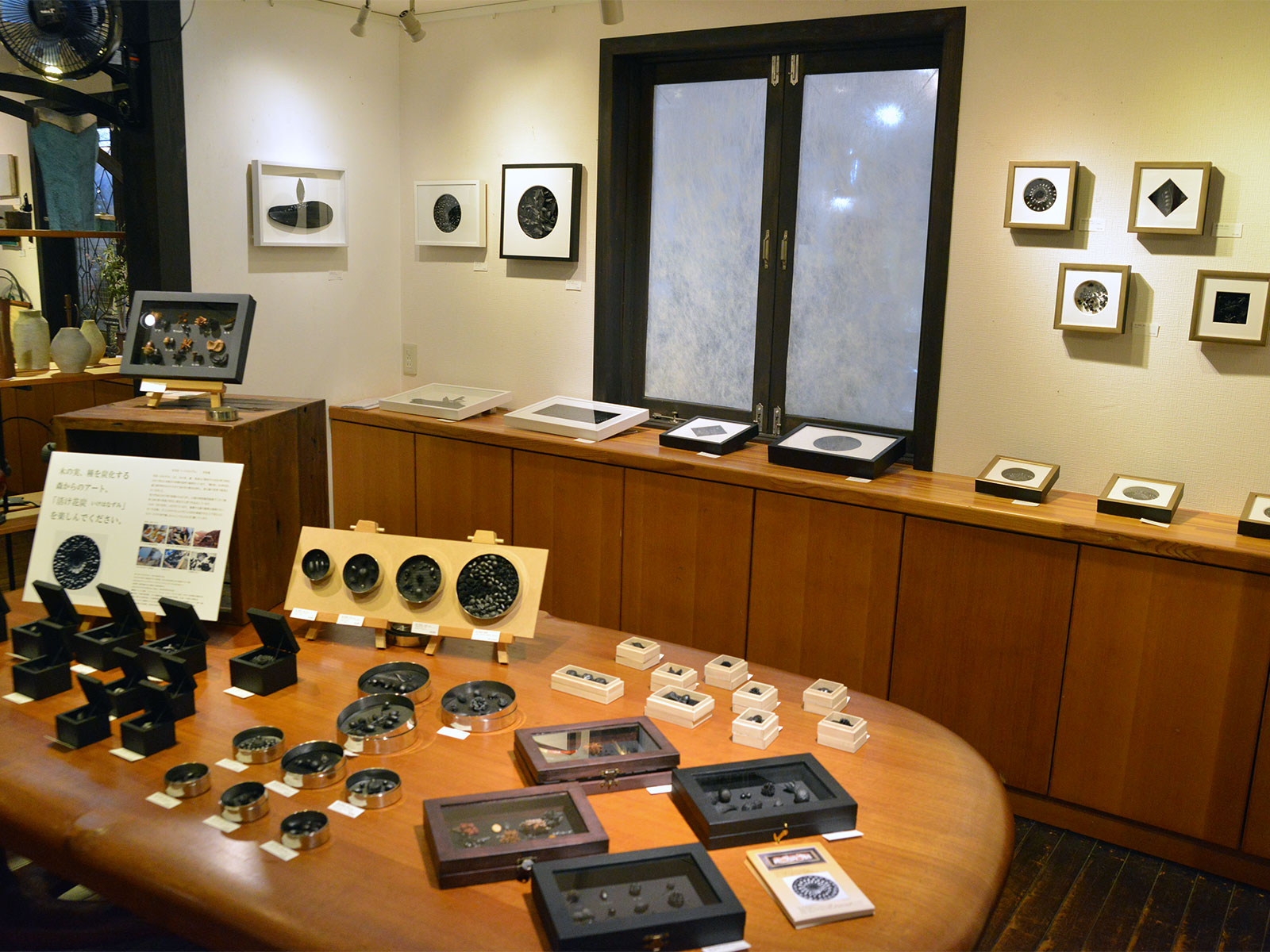 棒田和義さんの陶板アートと作宮隆さんの花炭アート。