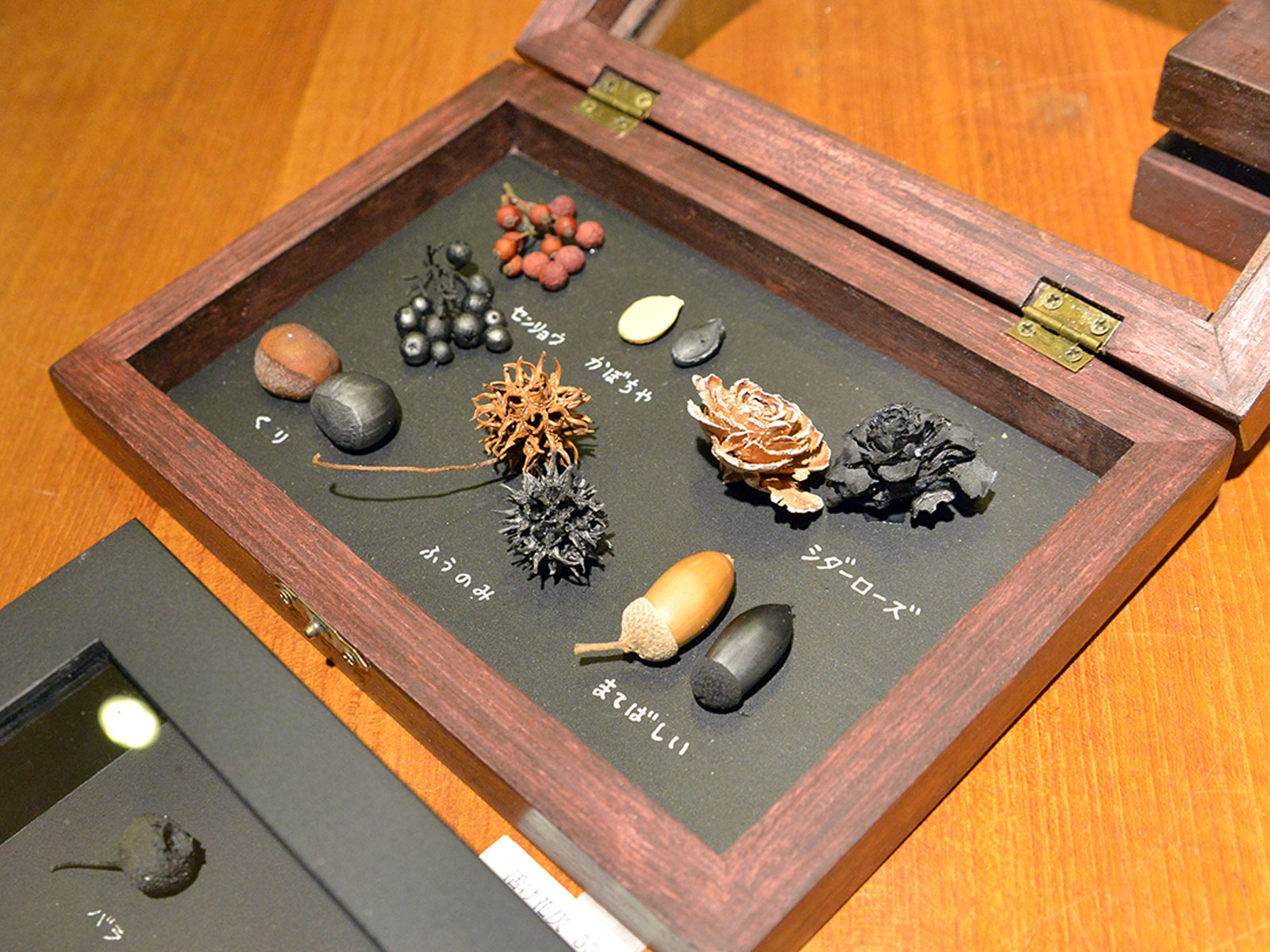 作宮さんは森で採れた実や種などを炭焼窯で三日三晩焼き、その炭化素材を活かして作品作りをされています。