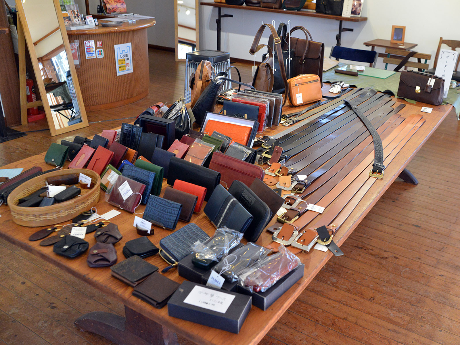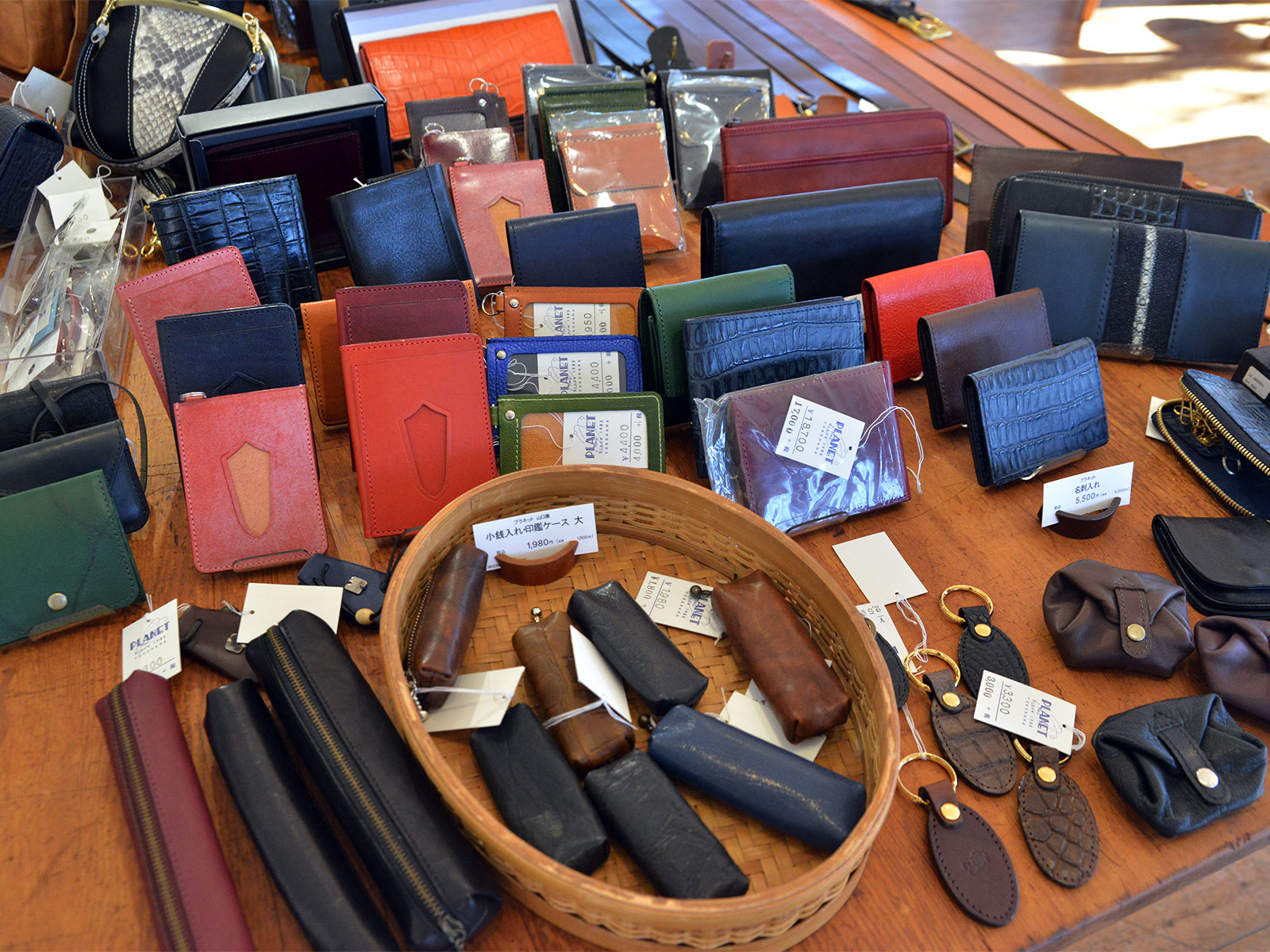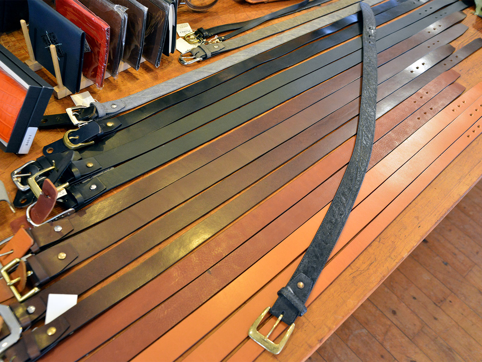 牛側以外にもゾウ革、エイ革、クロコダイル、パイソンなど、それぞれの革の特徴を活かして仕上げられています。