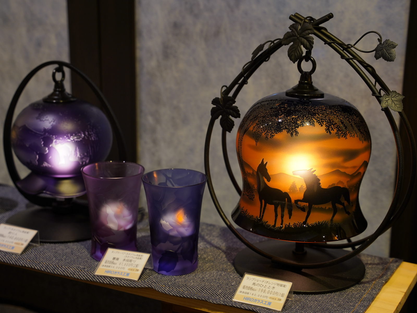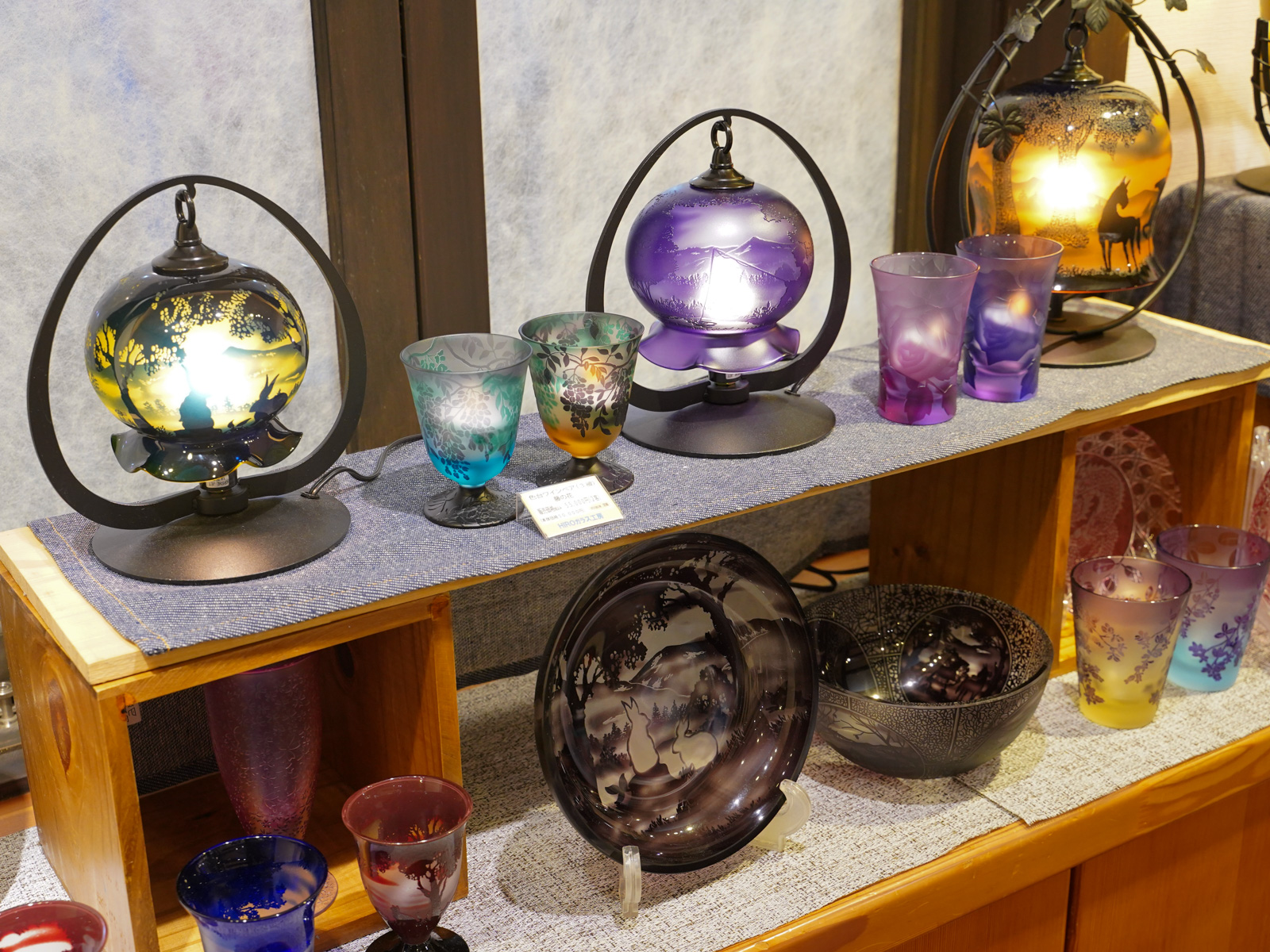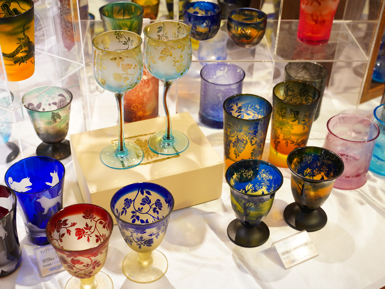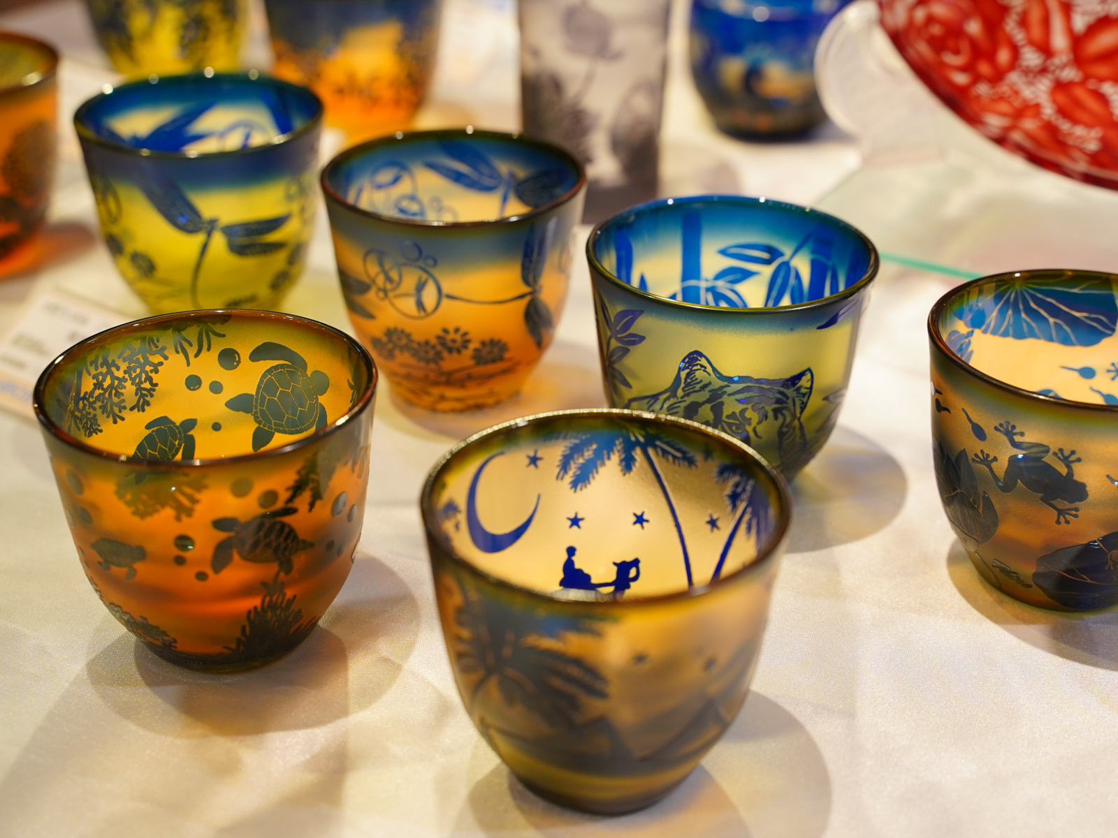 また、サンドブラストと切子の二つの技法を組み合わせた作品も繊細で見応えがあり、