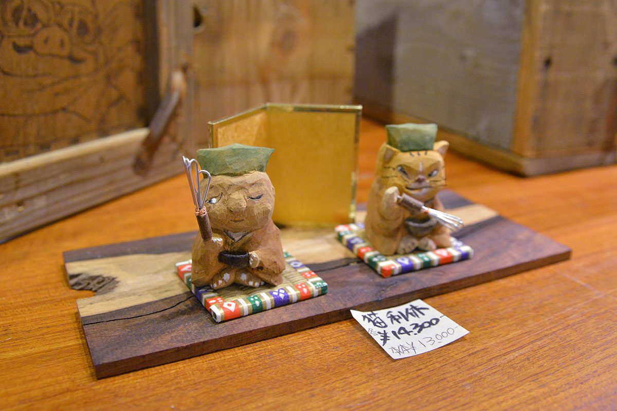 スタジオジブリグッズ、猫バス積み木の原型作家でもある三井さんの作品は小さなものから大きなものまで、どれも個性たっぷり。