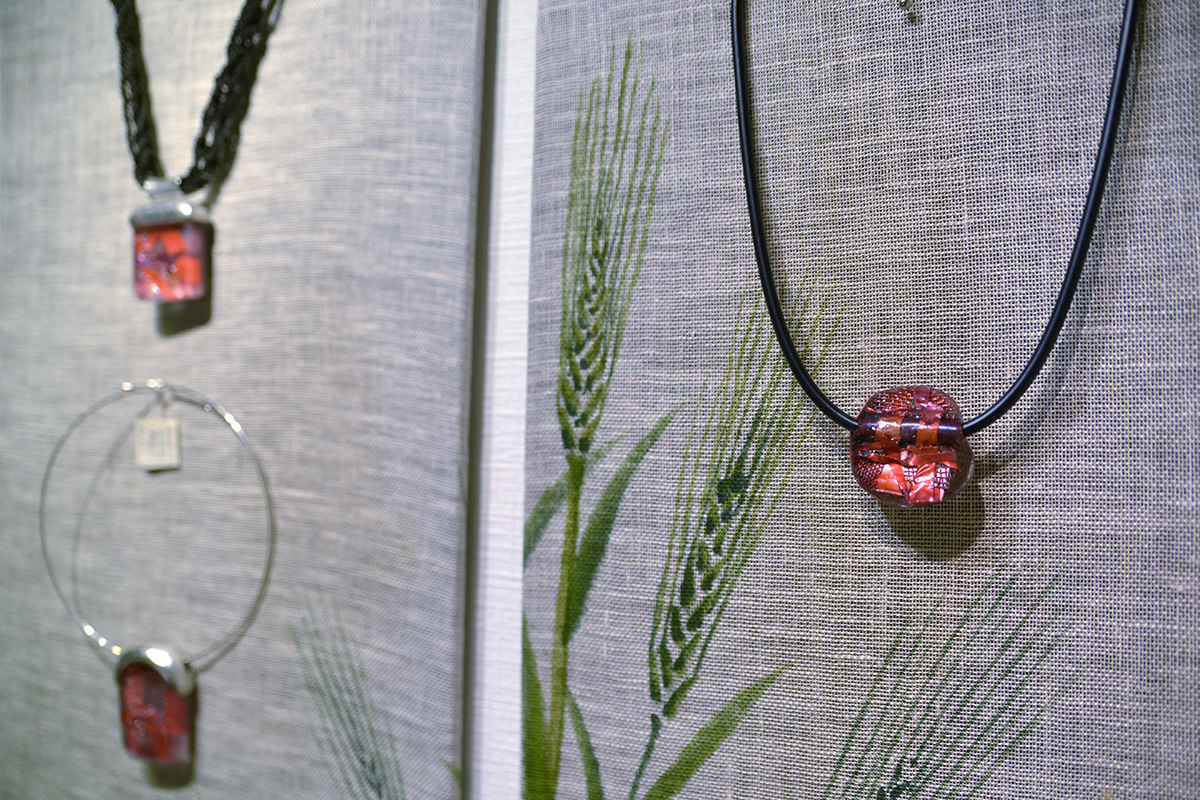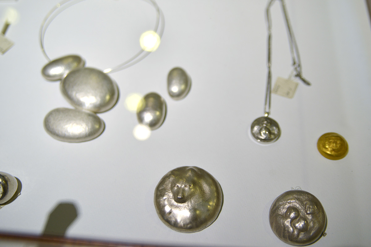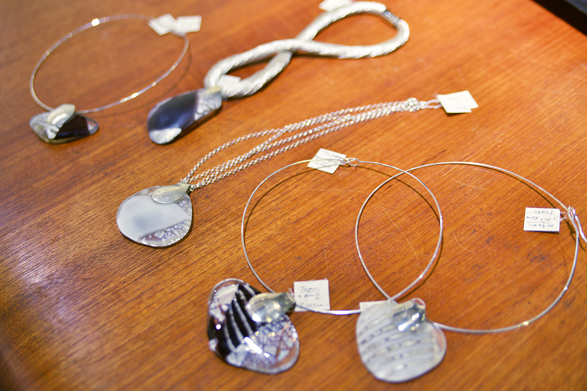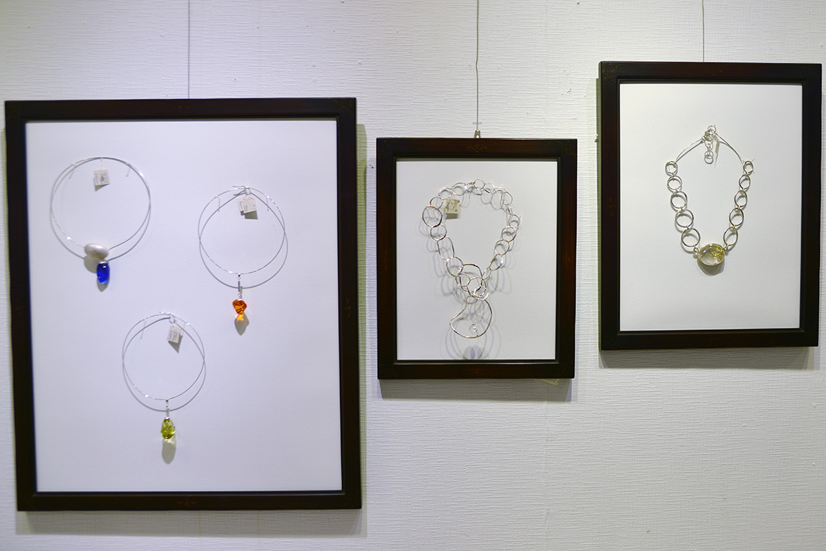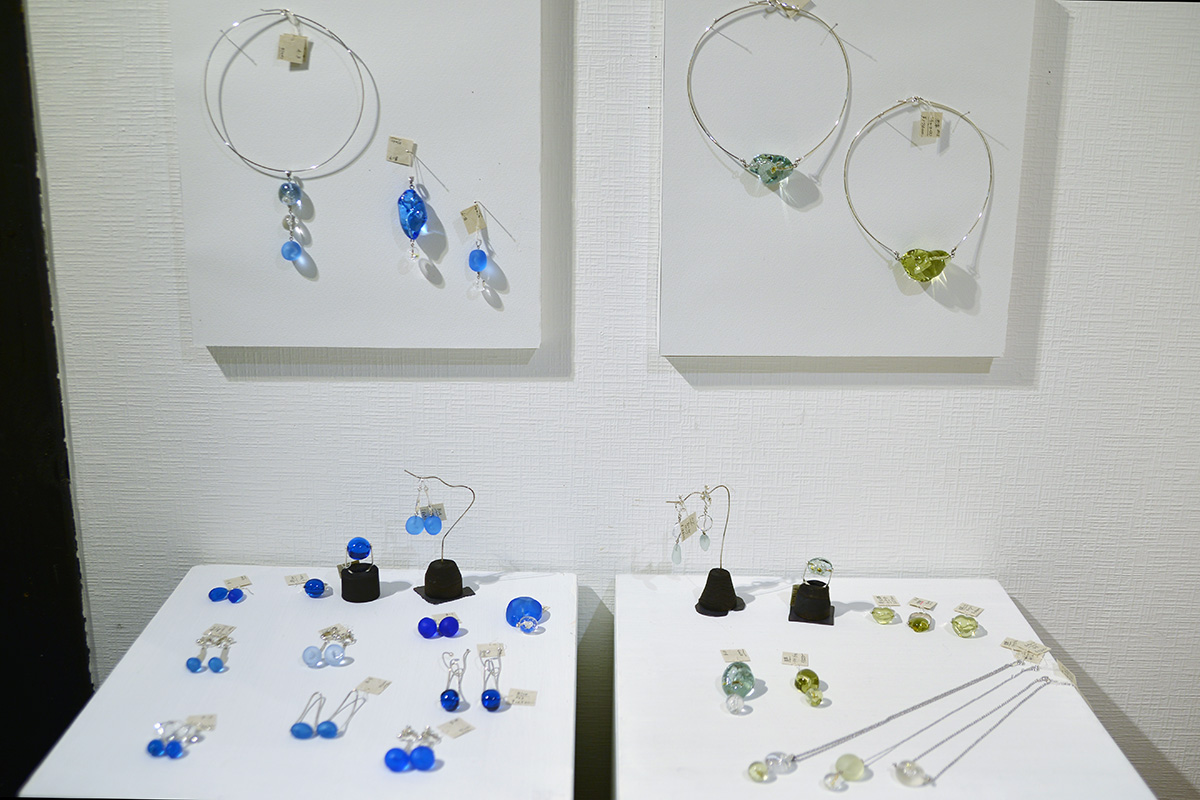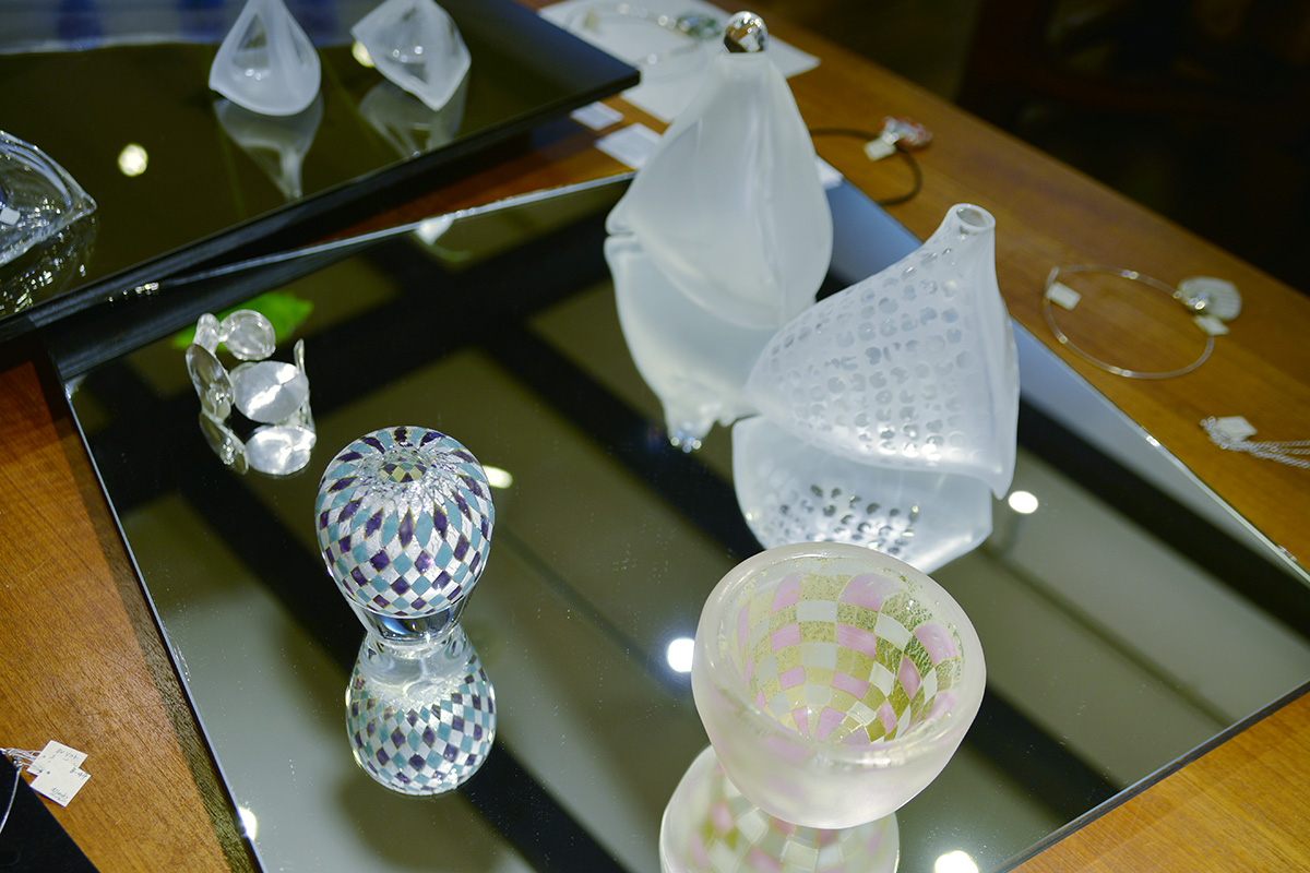 他にも、カラフルで美しいガラスを使った器や香水瓶、宝石と鍛金のジュエリーやペンダントなど。