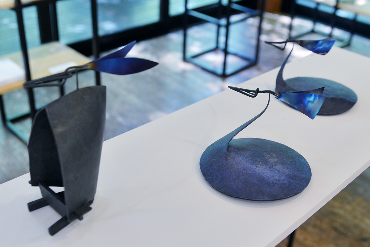 ほんの少しの力を加えるだけで複雑な動きを見せる、絶妙なバランスの鉄モビール作品。