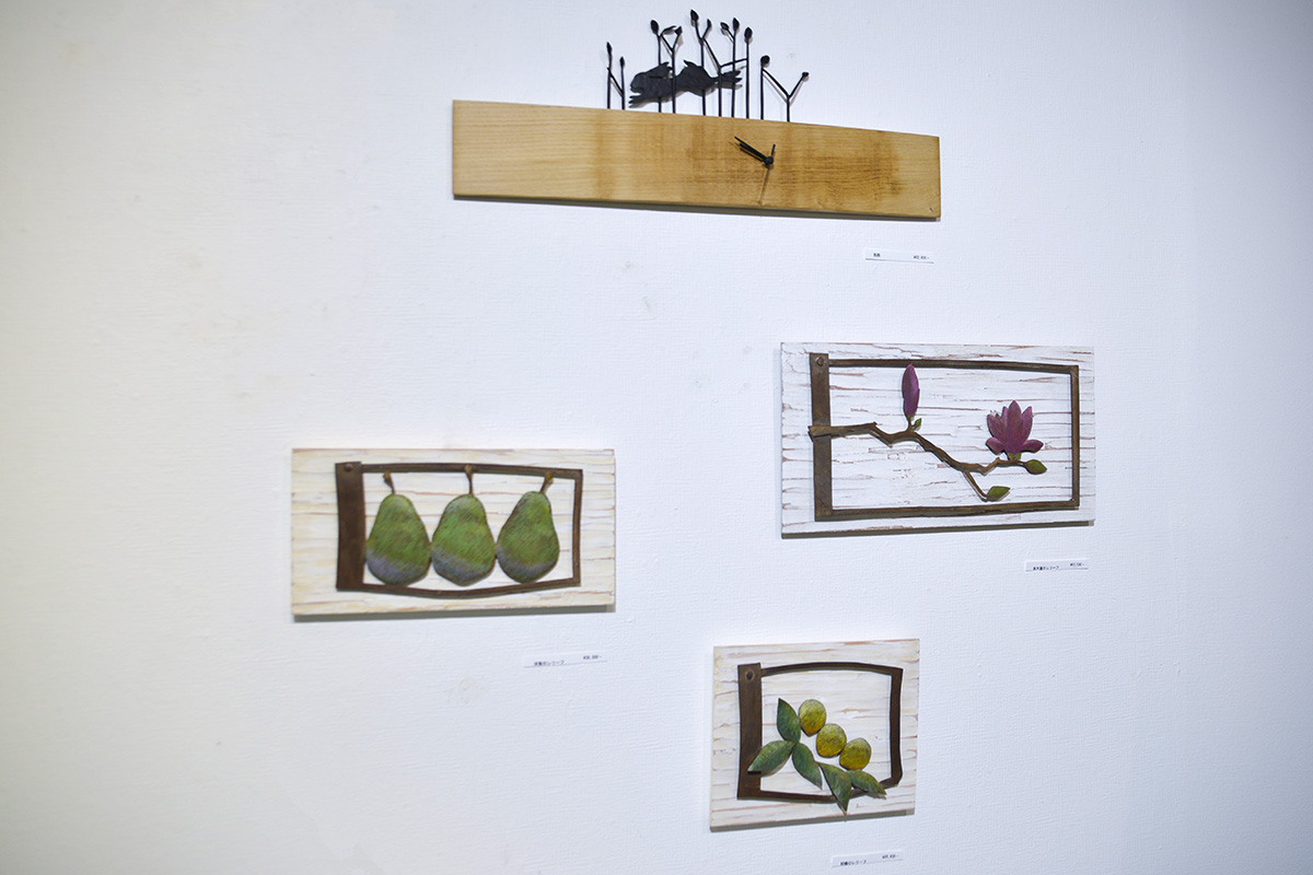 ウサギの駆ける時計、梟の香箱、指先ほどの猫や鹿、木蓮や洋ナシの壁掛けレリーフ。