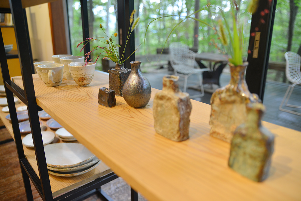 マット釉を中心に、しっとりと温かみある雰囲気の食器や花器が並びます。