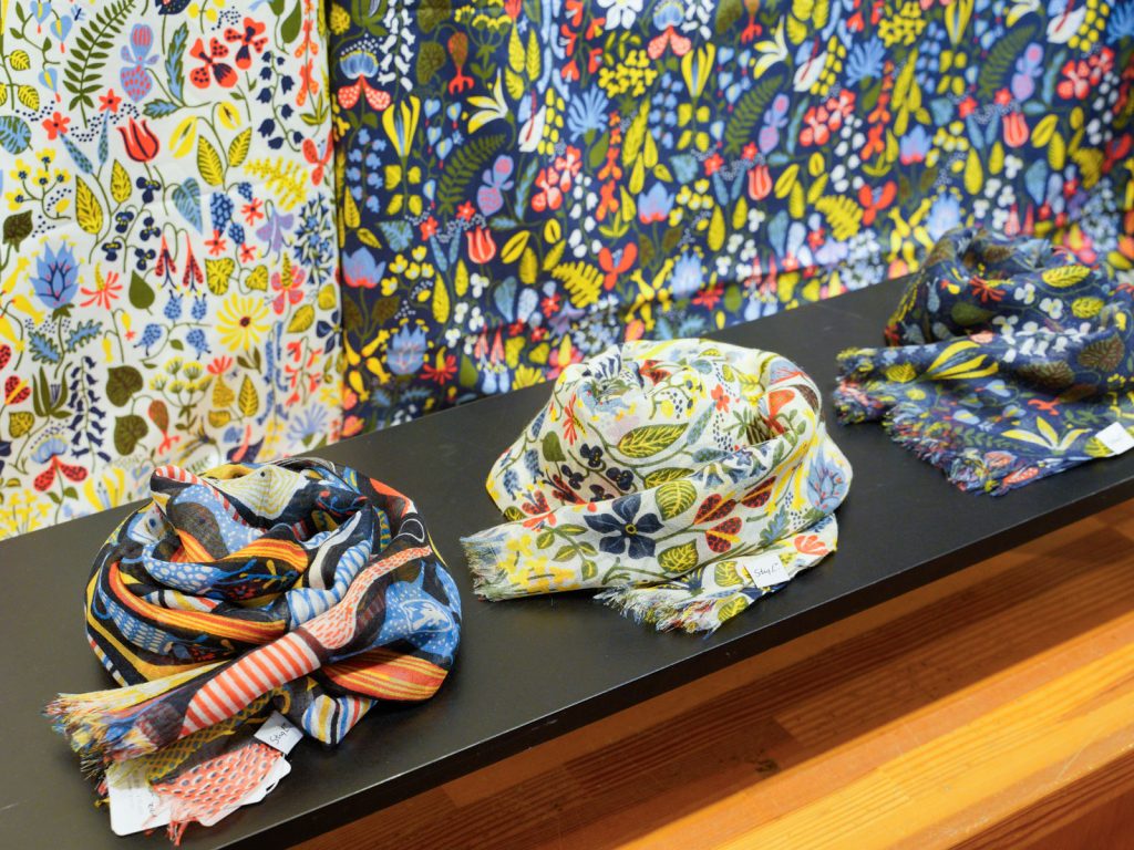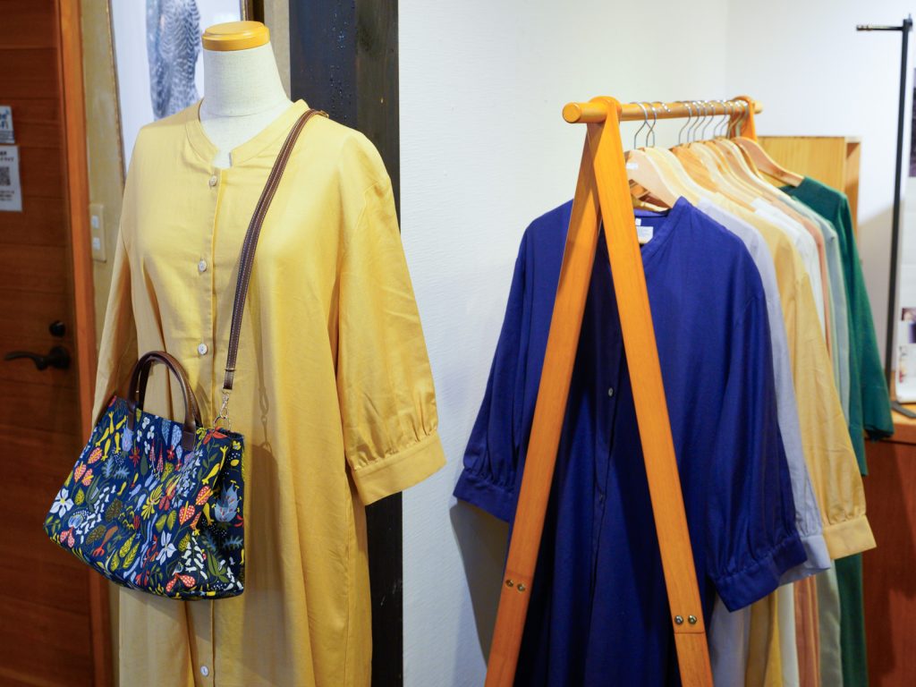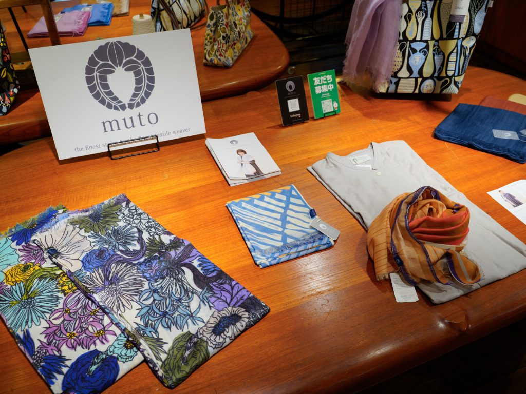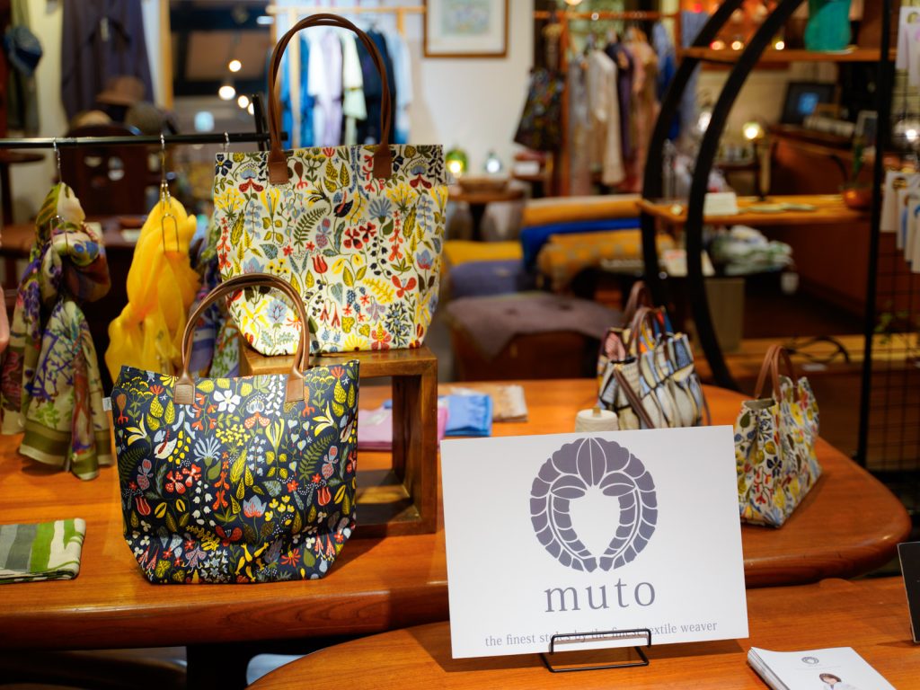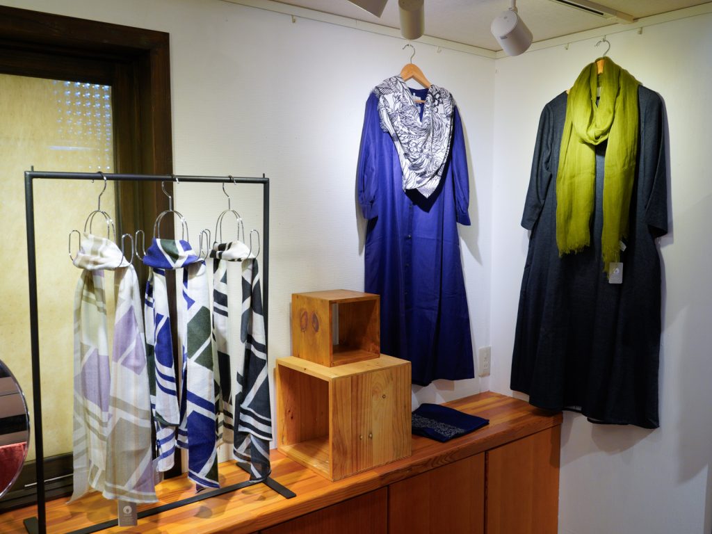 天然素材にこだわり、山梨の富士山麓で織物業を営む武藤さん。 カシミヤ、オーガニックコットン、リネン、シルクといった上質な素材を使い、富士山の清らかな水と澄んだ風によって、一枚一枚丁寧に美しいストールへと仕上げていきます。今回はストールだけでなく、ワンピースやバッグなど、糸から織物を製造する武藤さんならではの多彩なアイテムが揃いました。