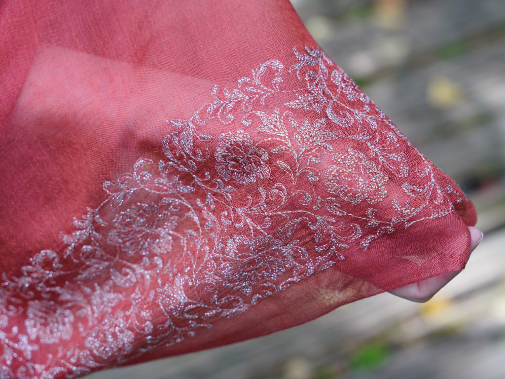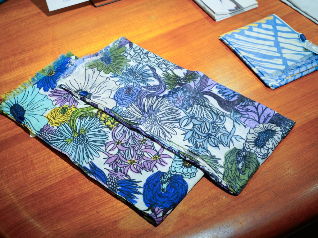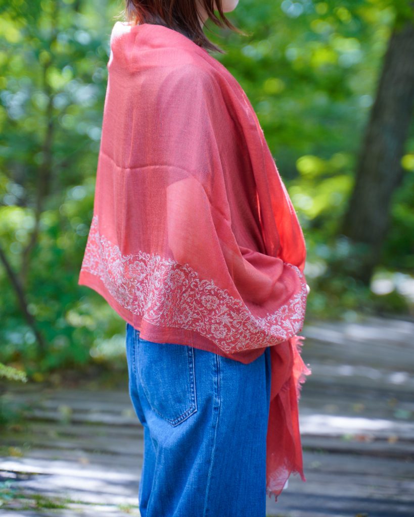 今回の新作は美しい刺繍が入ったシルクカシミアのストール。大判のストールですが想像以上の軽さと上質な肌触りを兼ね備えた逸品です。