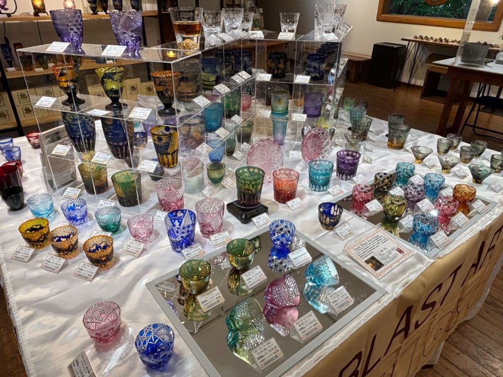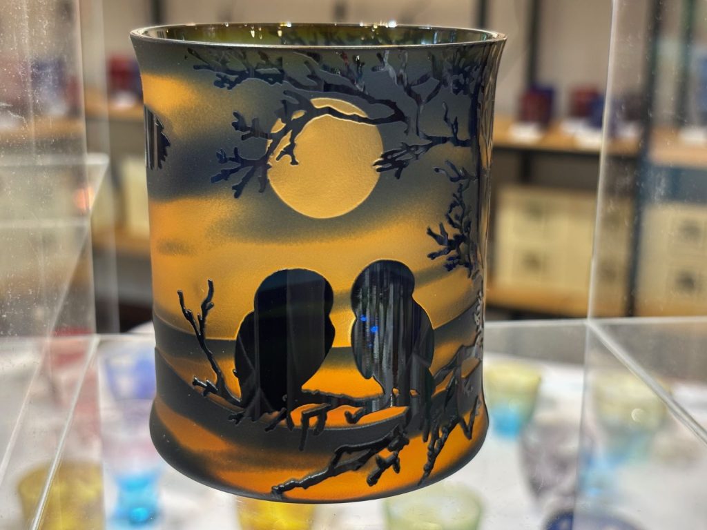 ガラスの表面に砂を吹き付けて削るサンドブラストは、重ねられたガラスの色合いと、削り出す厚みの差異で深い奥行きを感じる彫刻になります。