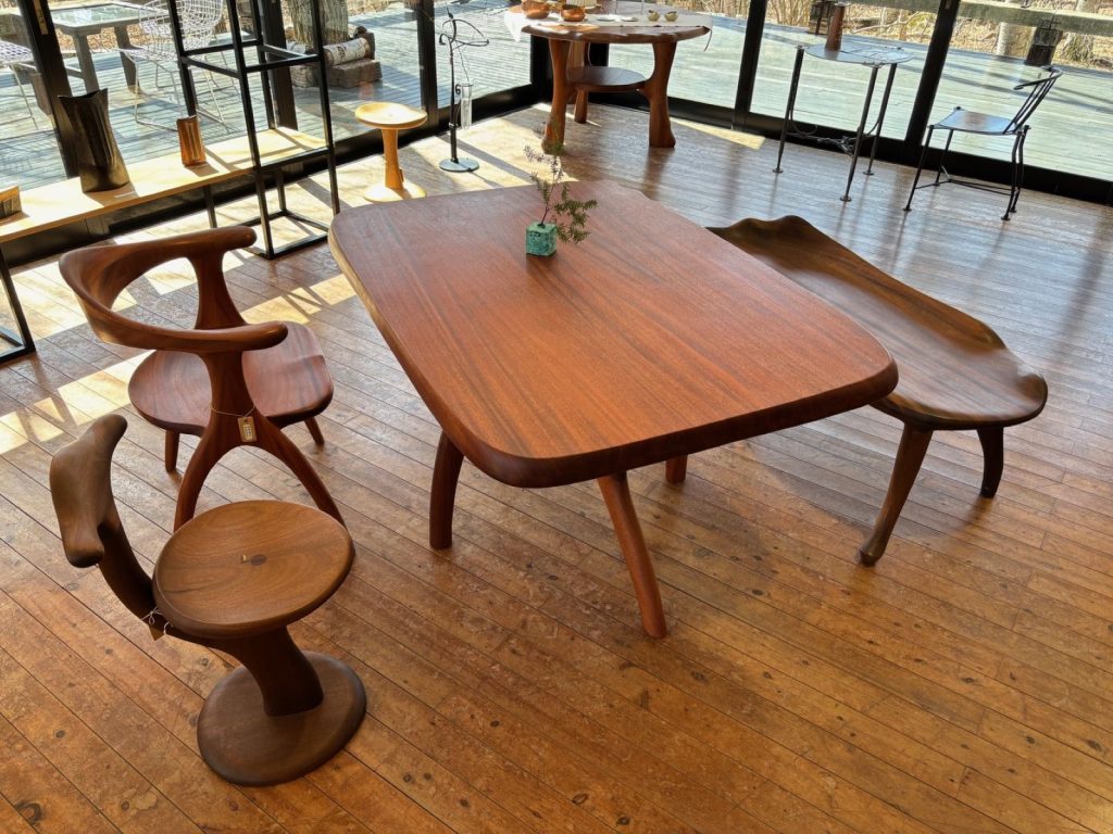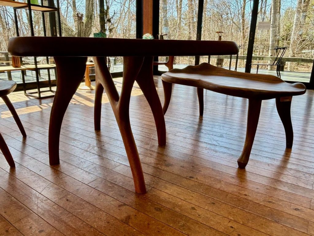 良工房さんの家具は「彫刻家具」と名付けられ、有機的なカーブを持った家具、どこを触っても尖った角がなくなめらか。是非触ったり腰掛けてその居心地の良さをじっくり体感してください。
