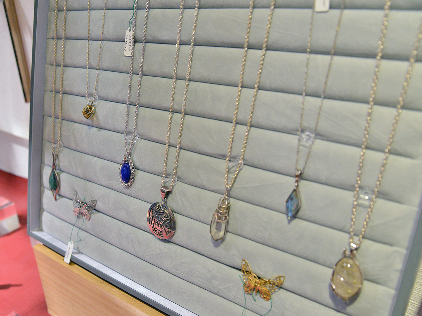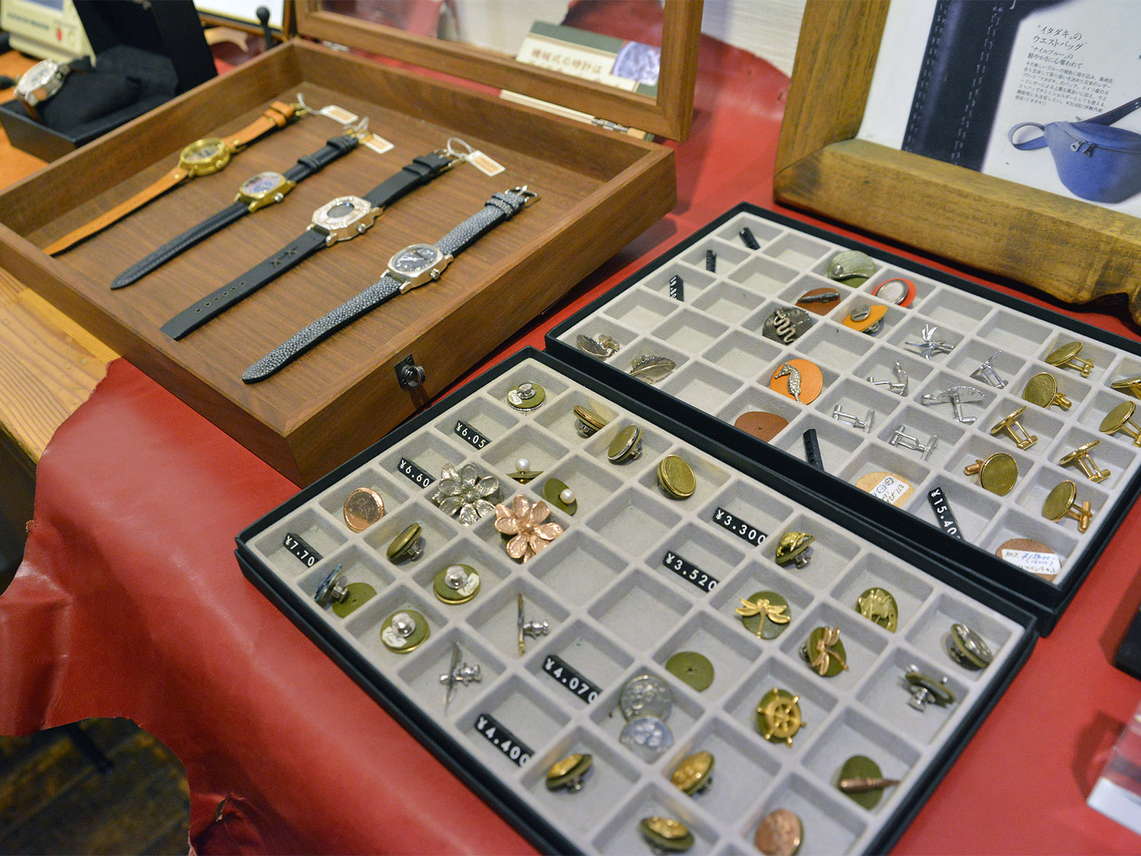 ミリ単位の彫金技術を活かしたイヤリング、ネックレス、カフスなどのアクセサリーも充実しています。