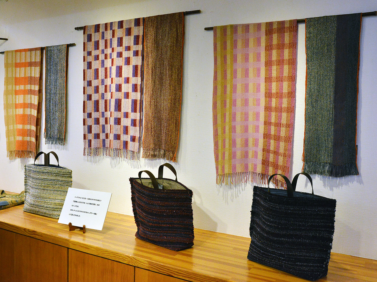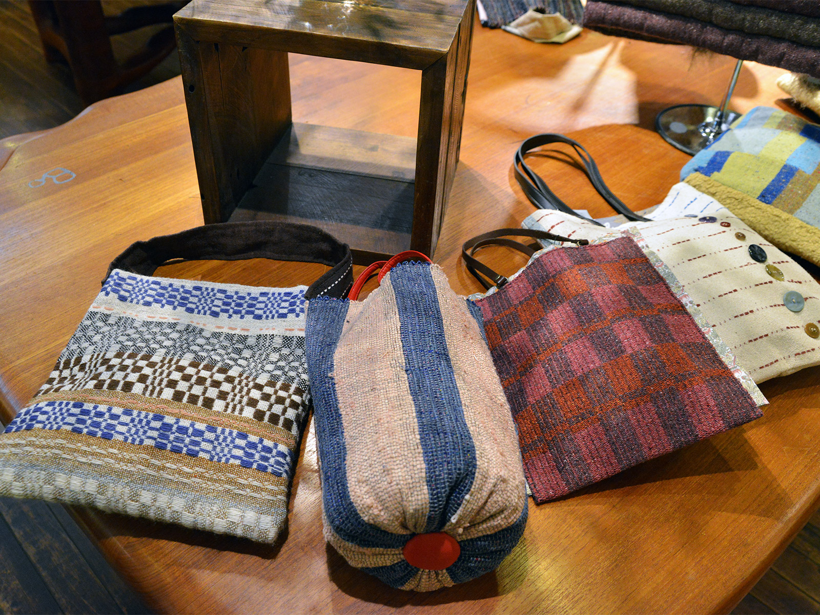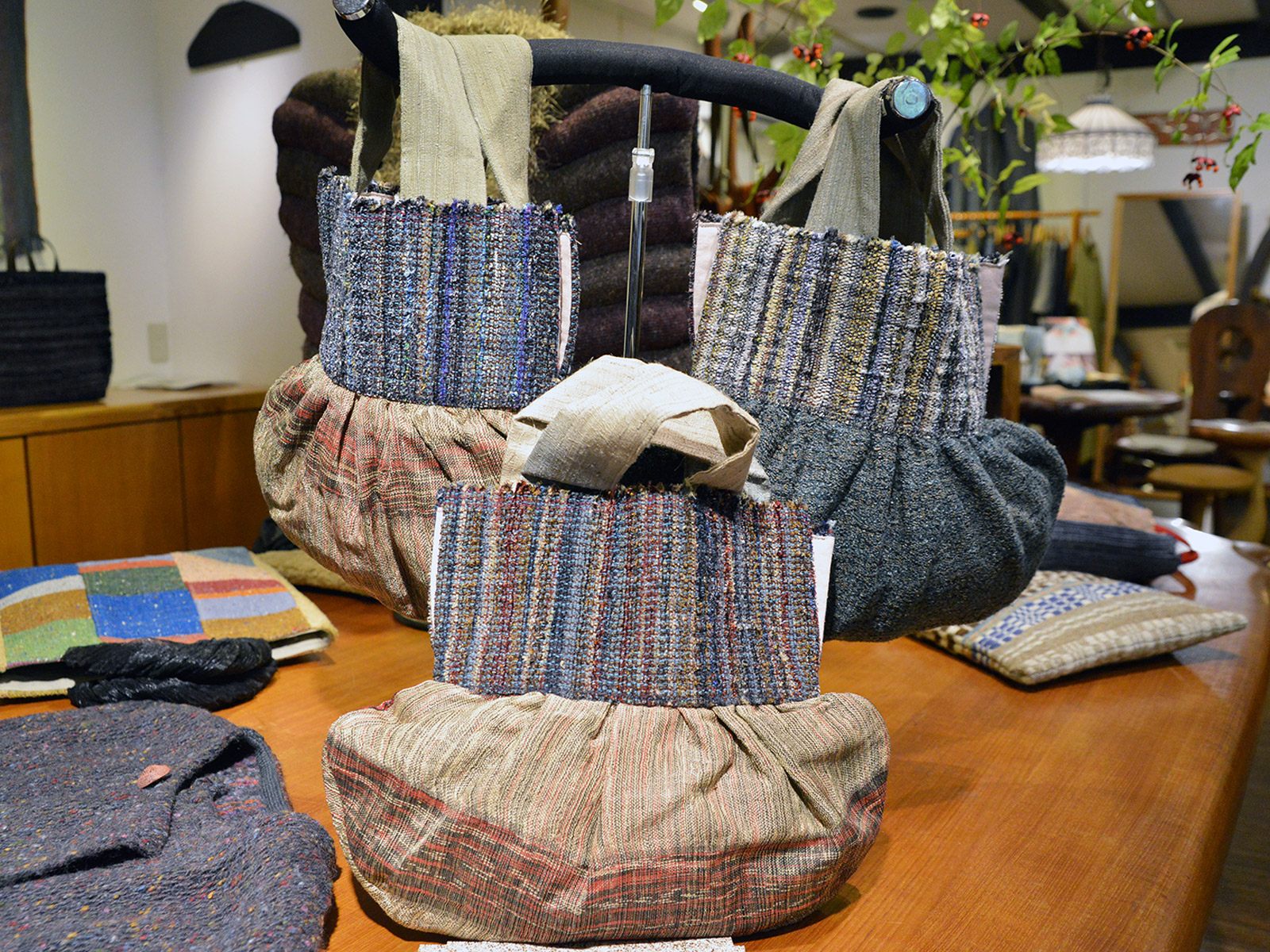 国府寺さんの代表作のひとつ、ネクタイの裂き織バッグは毎年大人気の作品。