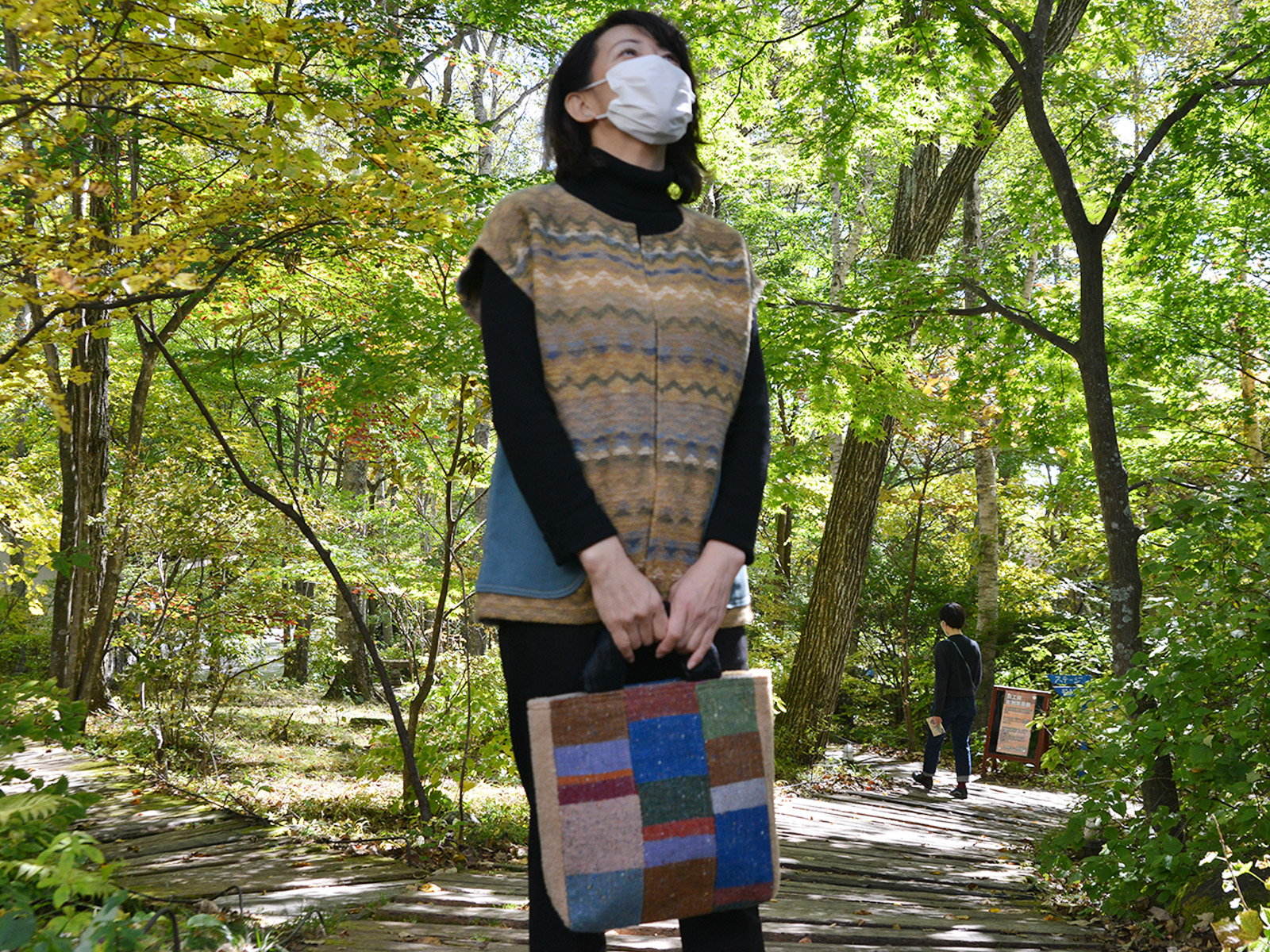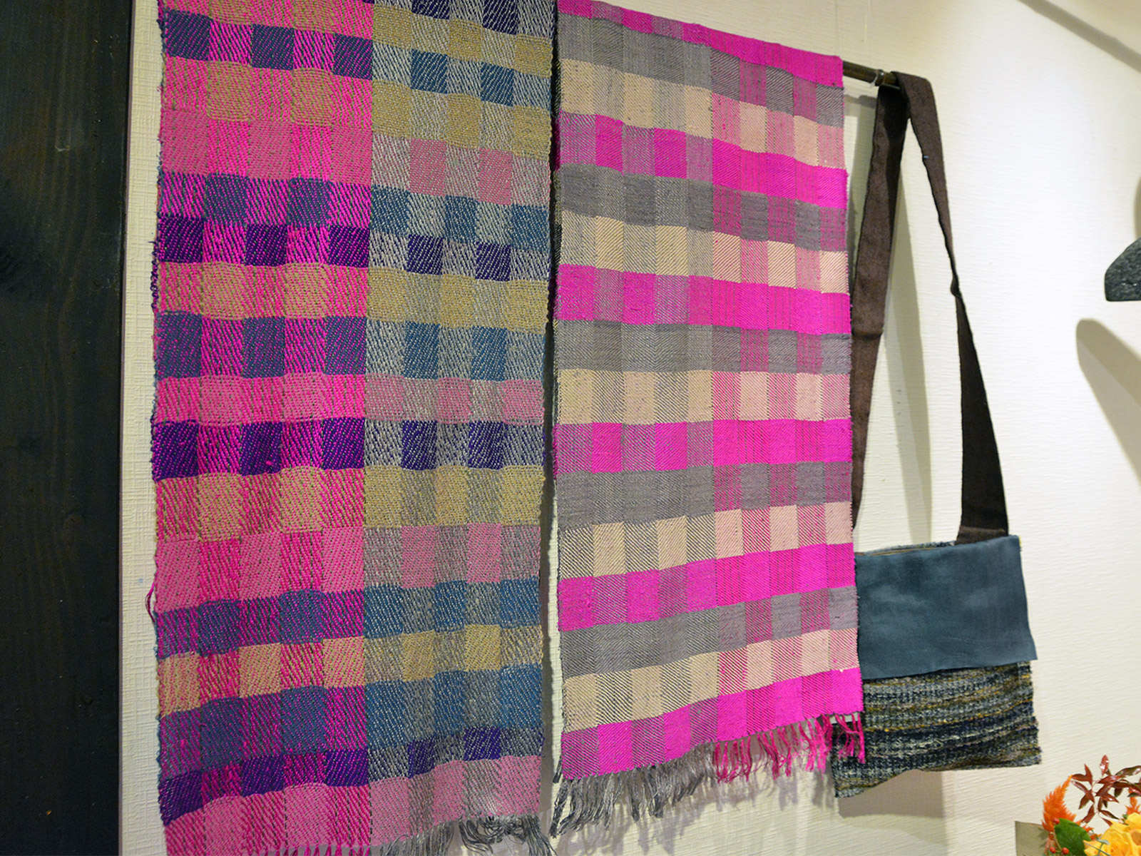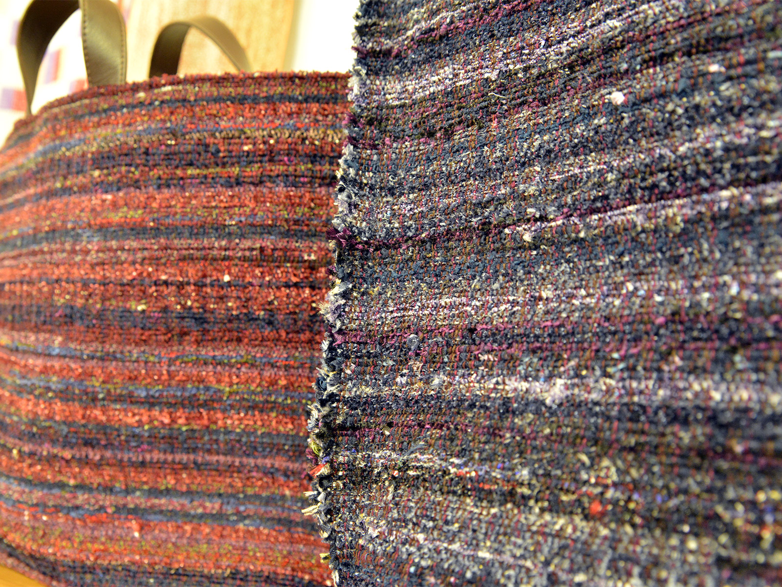 国府寺さんの代表作のひとつ、ネクタイの裂き織バッグは毎年大人気の作品。