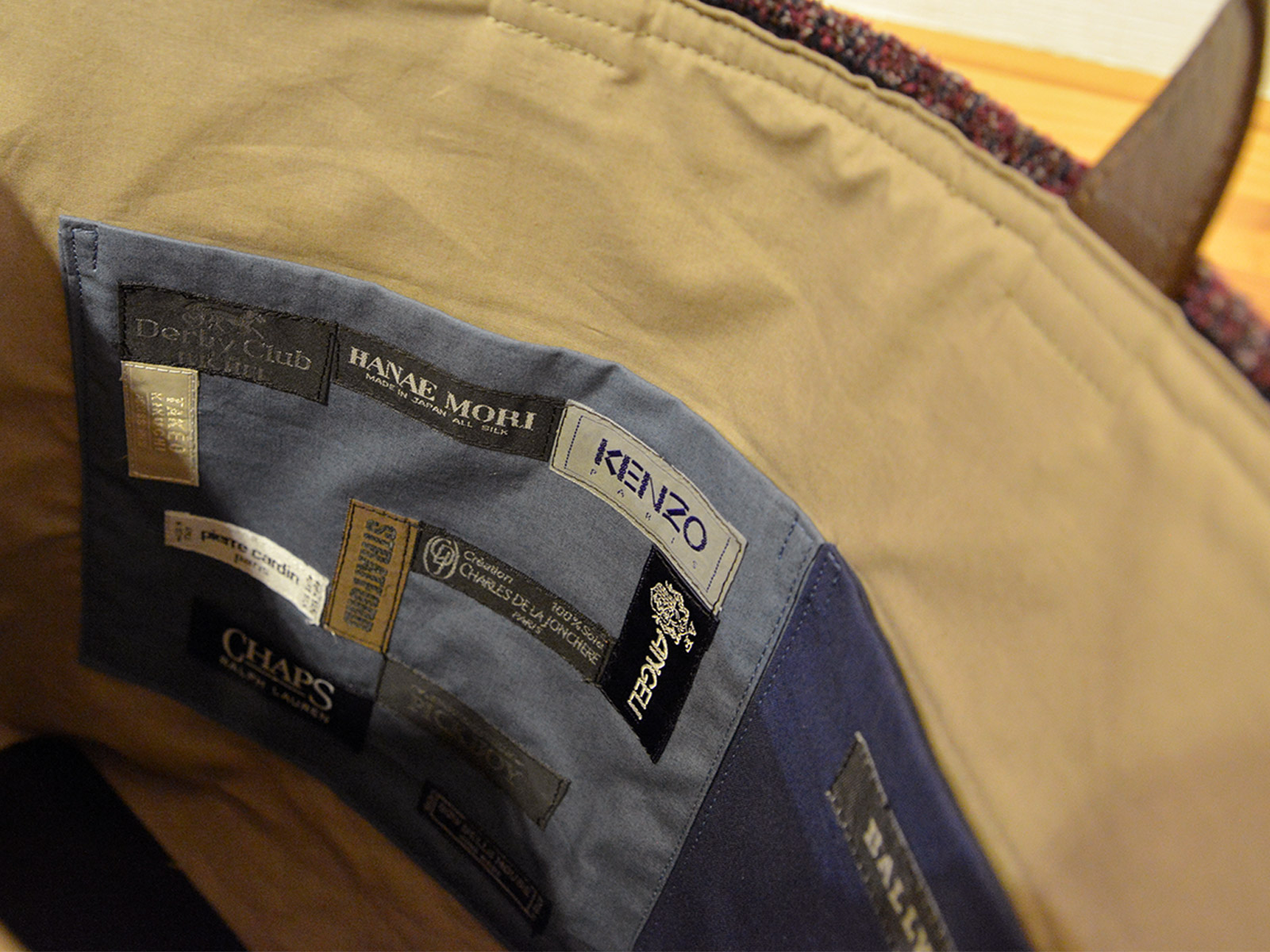 内側のポケット部分には使用したネクタイのブランドタグが縫い付けられていて、国府寺さんの遊びゴコロも感じられます。